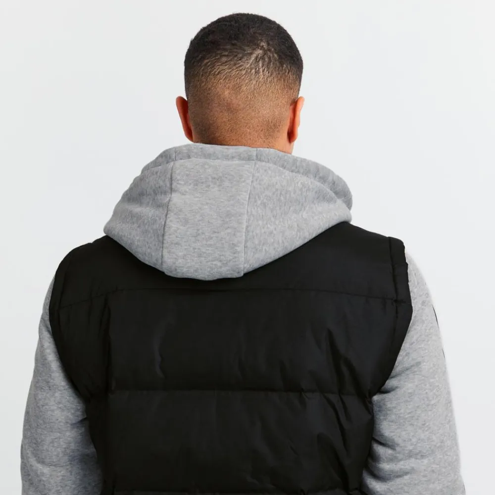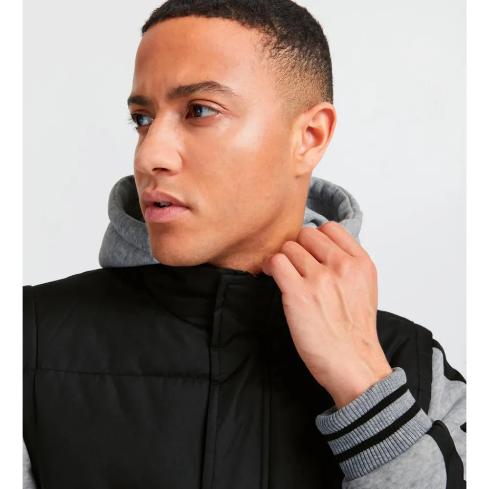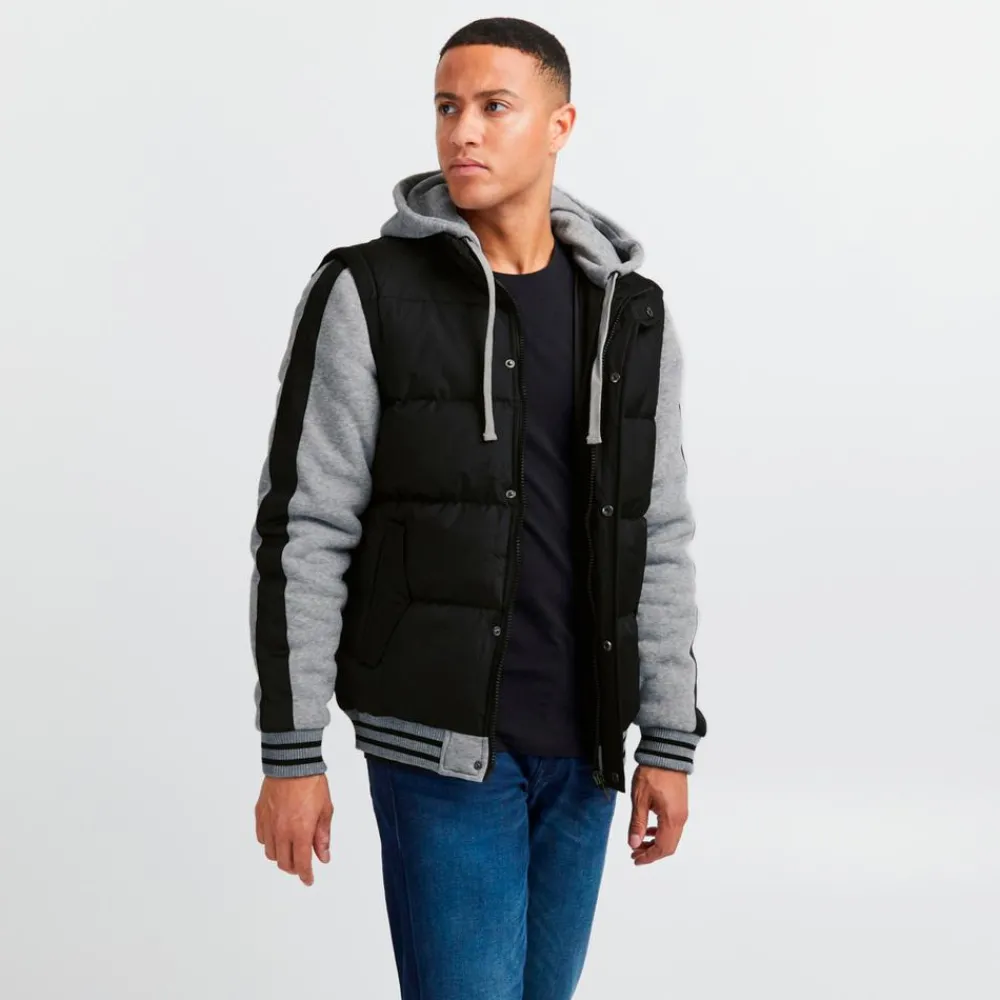 Blend herre jakke. Jakken har et udseende, som gør at det ligner en vest med en hættetrøje indenunder, men føles som en jakke indvendig. Jakken har en hætte med snøre, som gør at den kan tilpasses om hovedet. Jakken har gennemgående lynlåslukning og 2 sidelommer med knappelukning. Jakken har ribkant om ærmerne og om linningen.