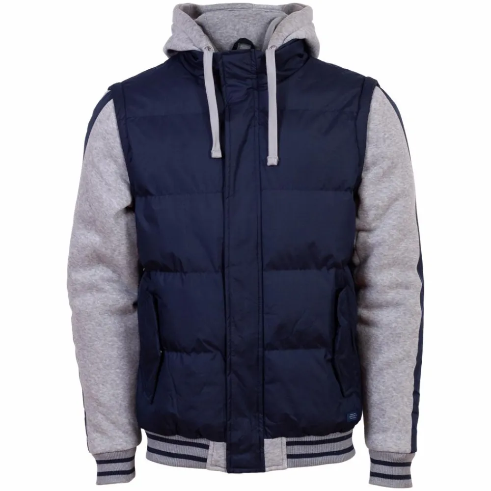 Blend herre jakke. Jakken har et udseende, som gør at det ligner en vest med en hættetrøje indenunder, men føles som en jakke indvendig. Jakken har en hætte med snøre, som gør at den kan tilpasses om hovedet. Jakken har gennemgående lynlåslukning og 2 sidelommer med knappelukning. Jakken har ribkant om ærmerne og om linningen.
