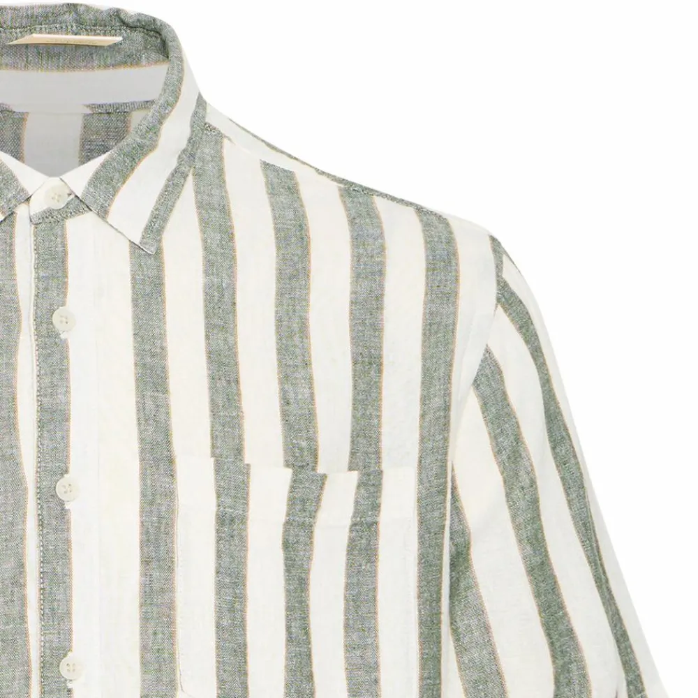 Blend plus size kortærmet herre skjorte i hørmix. Skjorten har grønne striber ned langs trøjen med små brune striber rundt om. Skjorten har en klassisk skjortekrave, knapper ned langs trøjen og en lomme på venstre side.