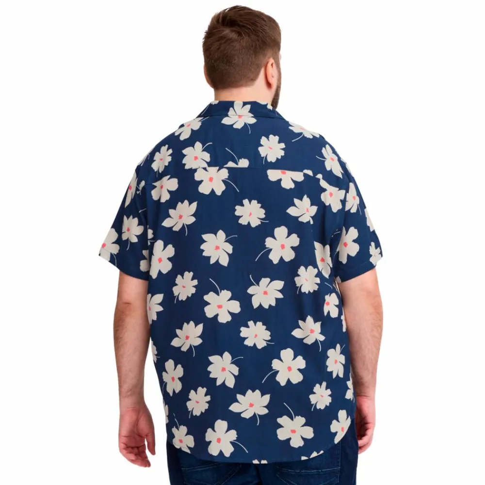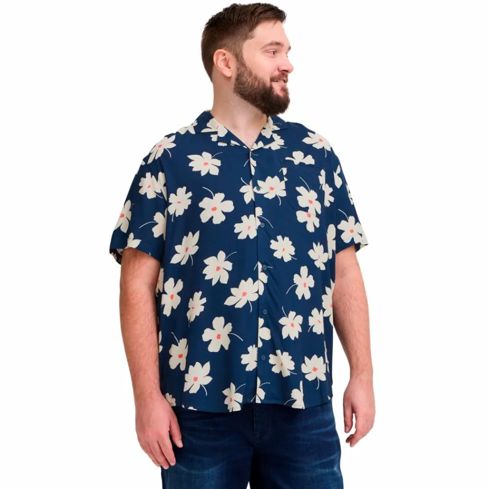 Blend plus size kortærmet skjorte med all-over print. Skjorten har en klassisk krave, en knaplukning foran og en enkelt brystlomme på venstre side.