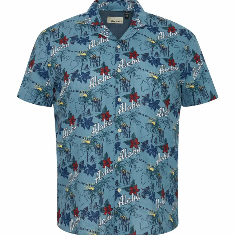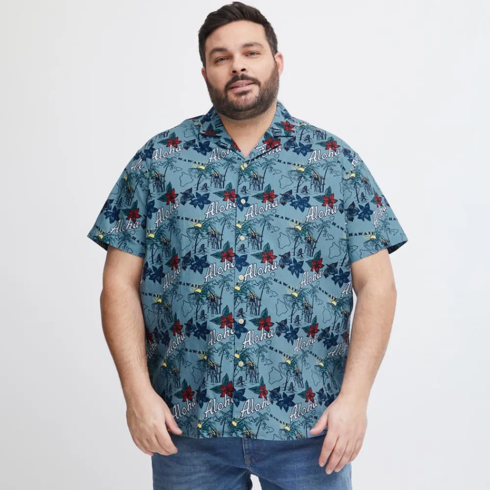 Blend plus size skjorte med korte ærmer, all-over print, gennemgående knaplukning og krave.