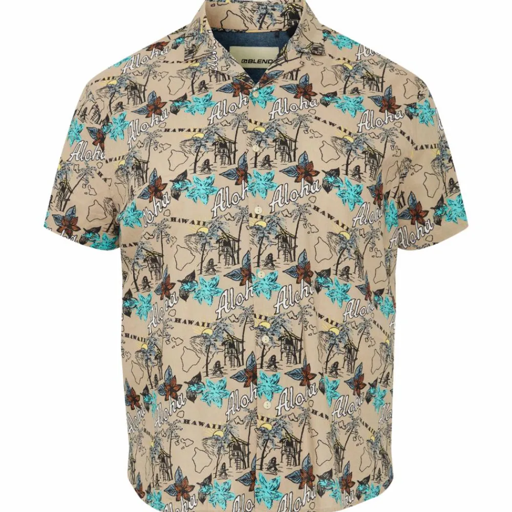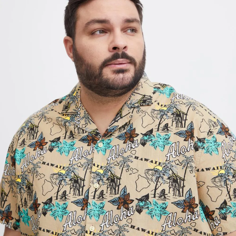 Blend plus size skjorte med korte ærmer, all-over print, gennemgående knaplukning og krave.