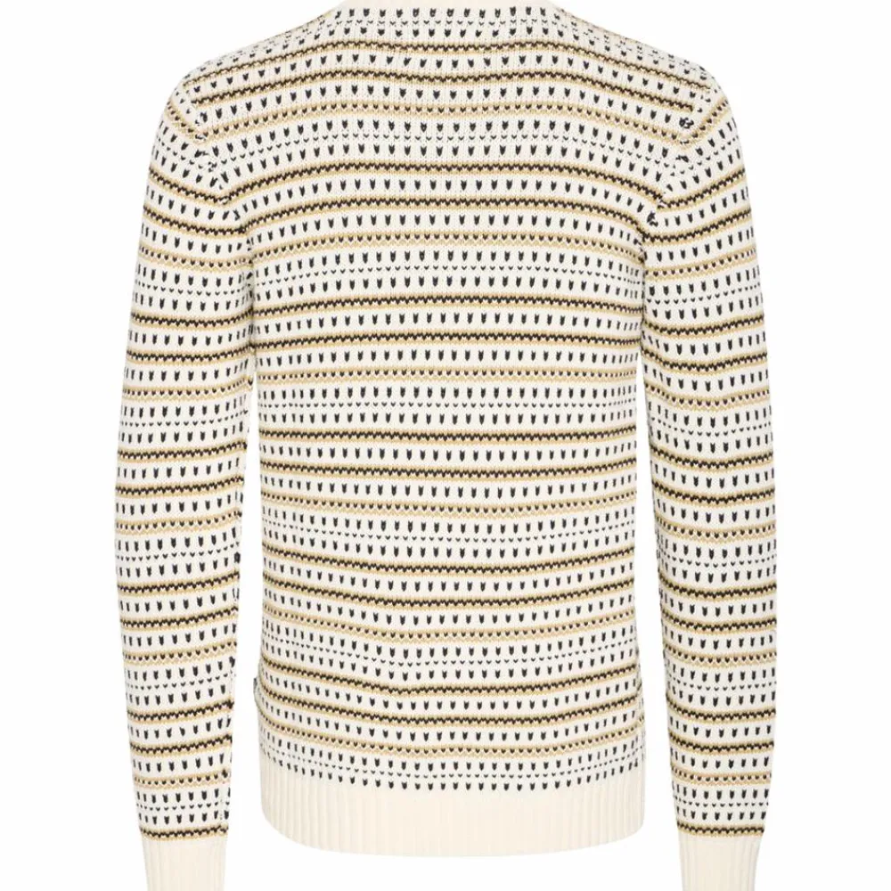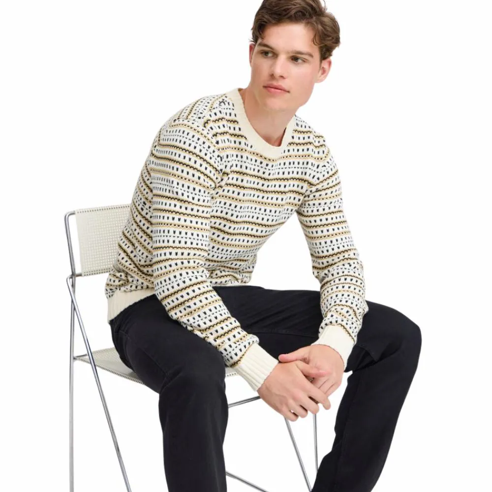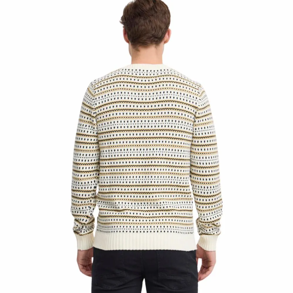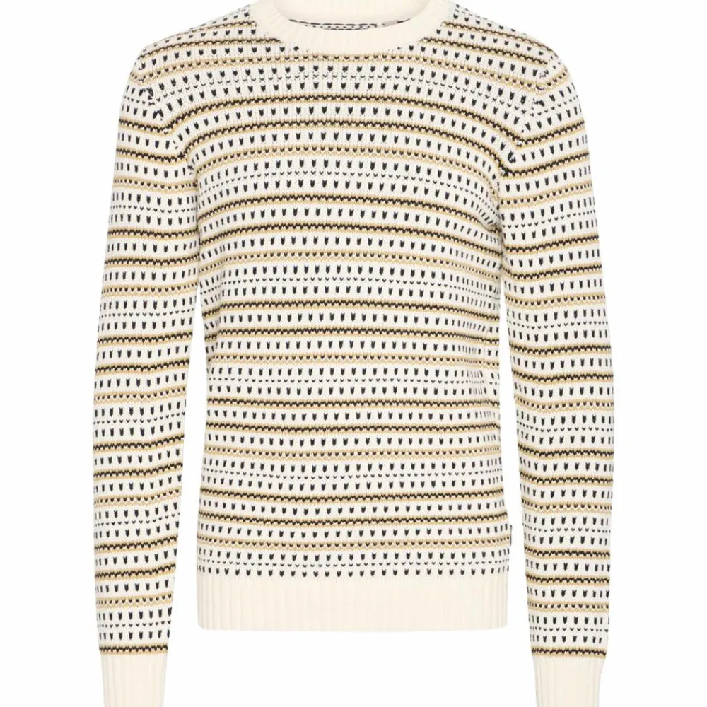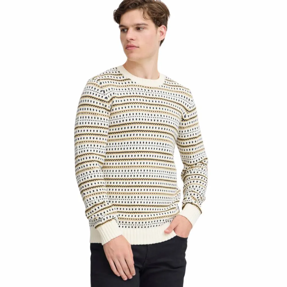 Blend herre striktrøje i flot mønster i naturlige farver. Det bløde og varme materiale gør den ideel til kølige dage, mens ribkanterne på ærmer, hals og bund sikrer en komfortabel pasform. Perfekt til både afslappede og semi-formelle anledninger.