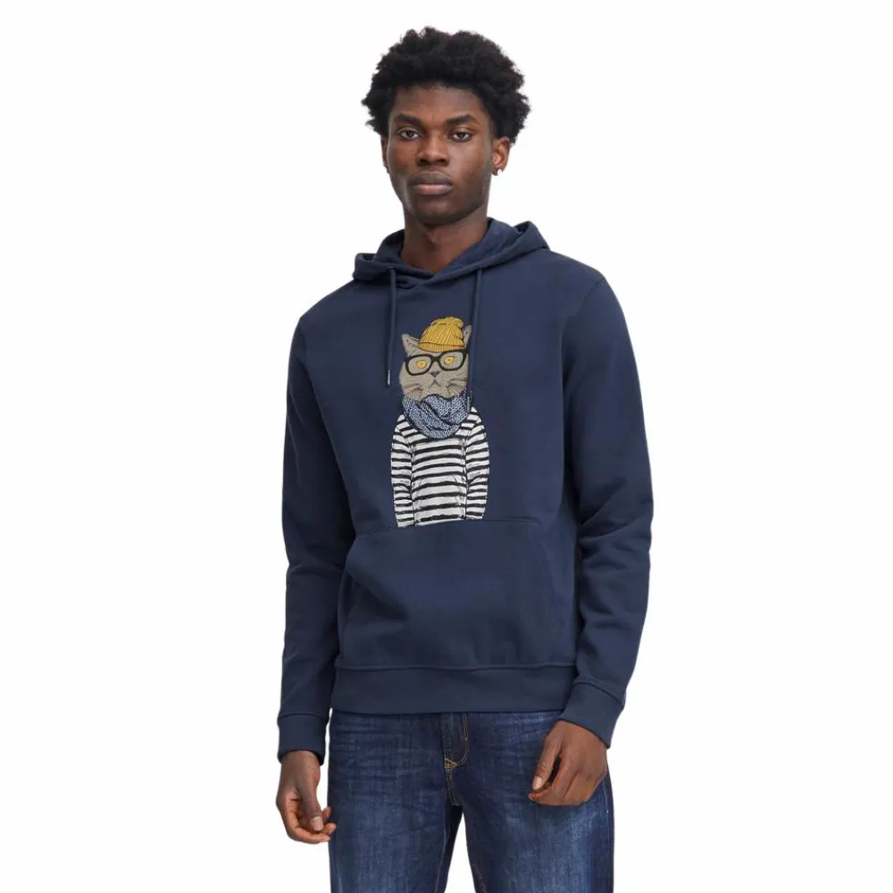 Blend herre langærmet sweat med print på fronten. Trøjen har hætte med snøre, kængurulomme samt ribkant ved ærmer og bund.