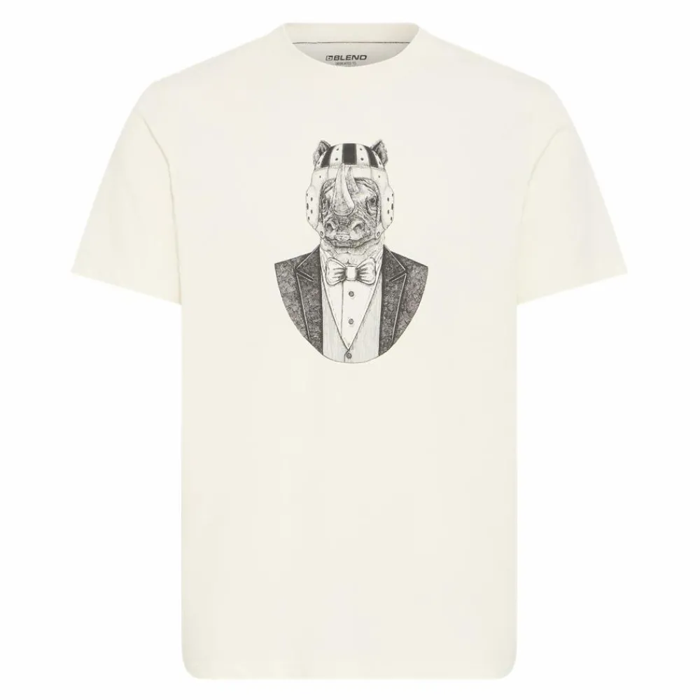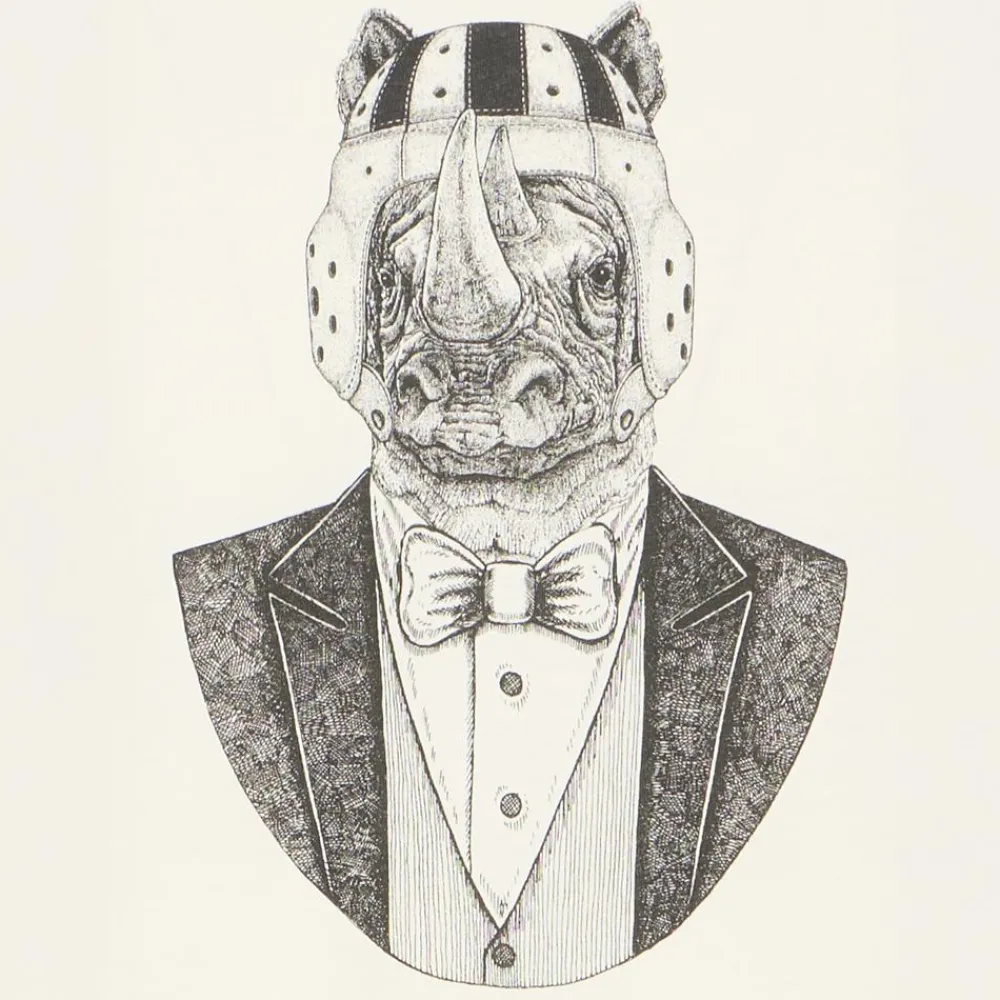Midt på brystet sidder et kunstnerisk motiv af et næsehorn iført hjelm, skjorte, smokingjakke og butterfly — en legende kontrast, der giver dit look karakter uden at fylde for meget. Style den med et par jeans til hverdagen, eller bær den under en åben skjorte for et mere sammensat udtryk. Se også vores udvalg af t-shirts og tanktops for flere favoritter.