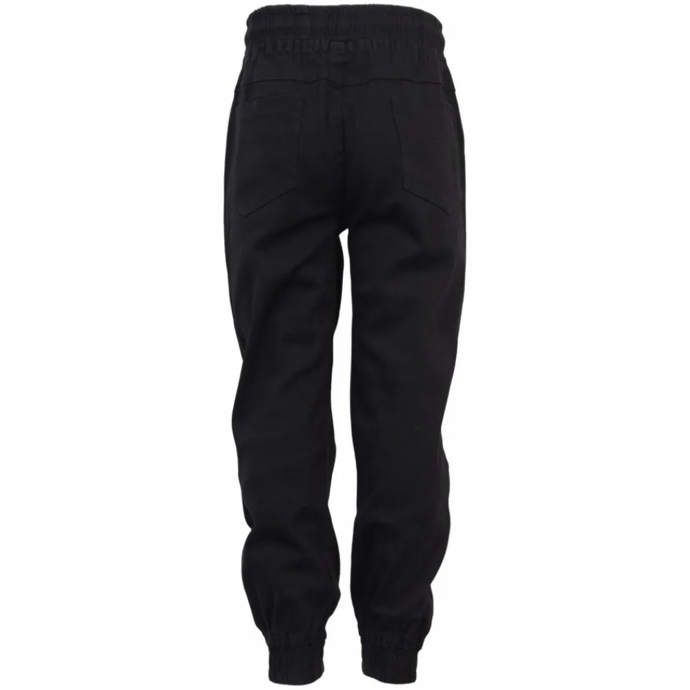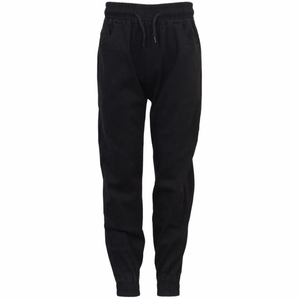Bukser med denimeffekt og afslappet pasform. Bukserne har elastik og snøre i taljen. Bukserne har lommer bagpå og foran samt en møntlomme. Bukserne har elastikrib ved buksebenets afslutning, som skaber et let poset look.