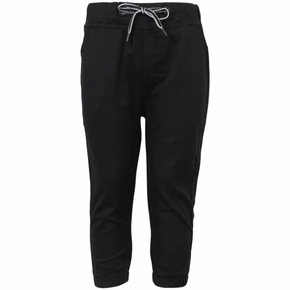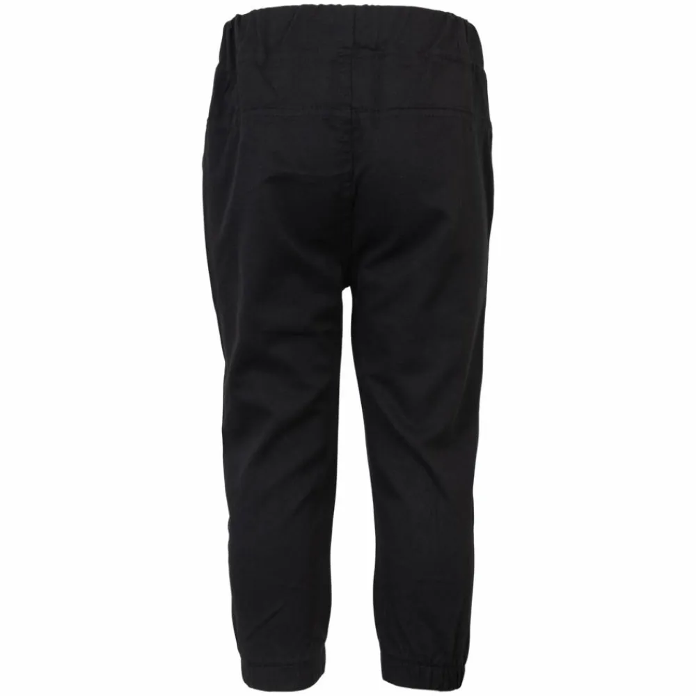 Bløde sorte bukser til børn, der følger med i tempoet fra skole til leg. Den elastiske talje med stribet snøre giver en sikker og let justerbar pasform, mens rib ved anklerne samler looket og holder buksebenet på plads. 100% bomuld føles rart mod huden og lader kroppen ånde, så komforten er i top hele dagen. Se flere bukser til garderoben.