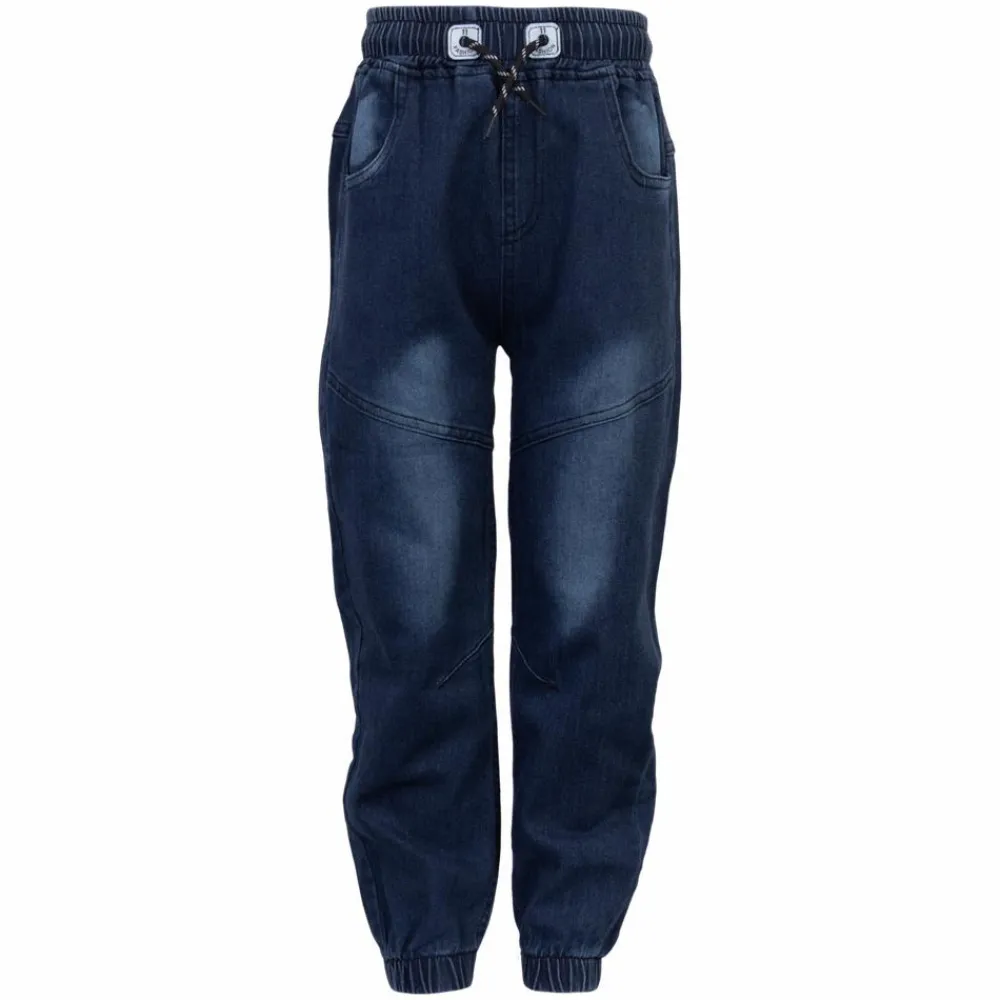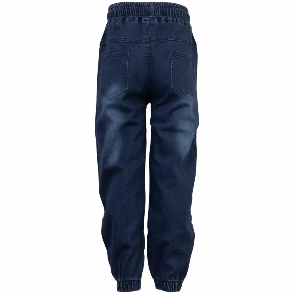 Jeans med afslappet pasform, elastik og snøre i taljen. Bukserne har lommer på bagsiden og forsiden. Bukserne har elastik ved buksebenet og syninger på låret.