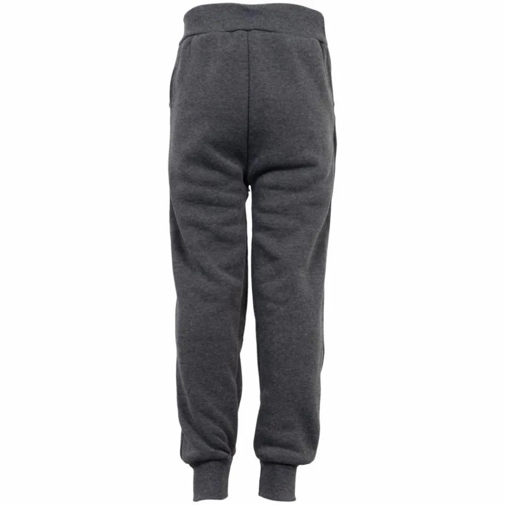 Børne joggingbukser med børstet inderside. Bukserne har elastik ribkant ved taljen og ved buksebenets afslutning. Bukserne har sidelommer og snøre ved taljen. Bukserne har en syning på tværs af buksebenet og et blåt “P” på det ene lår.