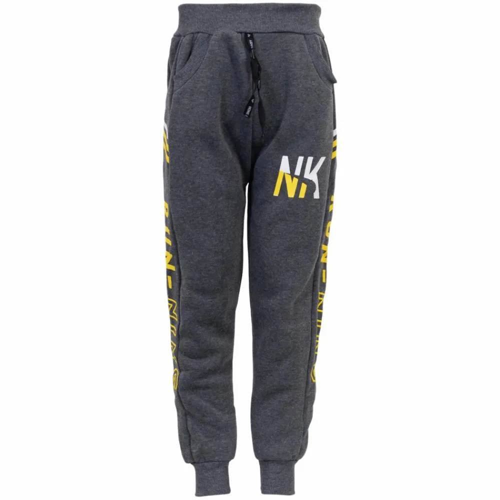 Børne joggingbukser med sidelommer. Bukserne har print ned langs siderne. Bukserne har elastik ribkant ved taljen og ved buksebenets afslutning. Bukserne har bindebånd ved taljen og en børstet inderside.