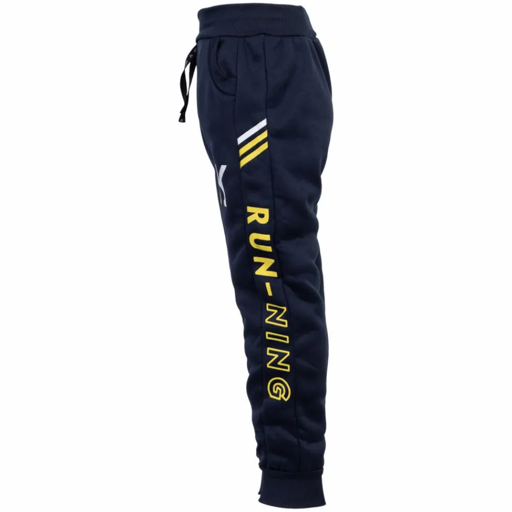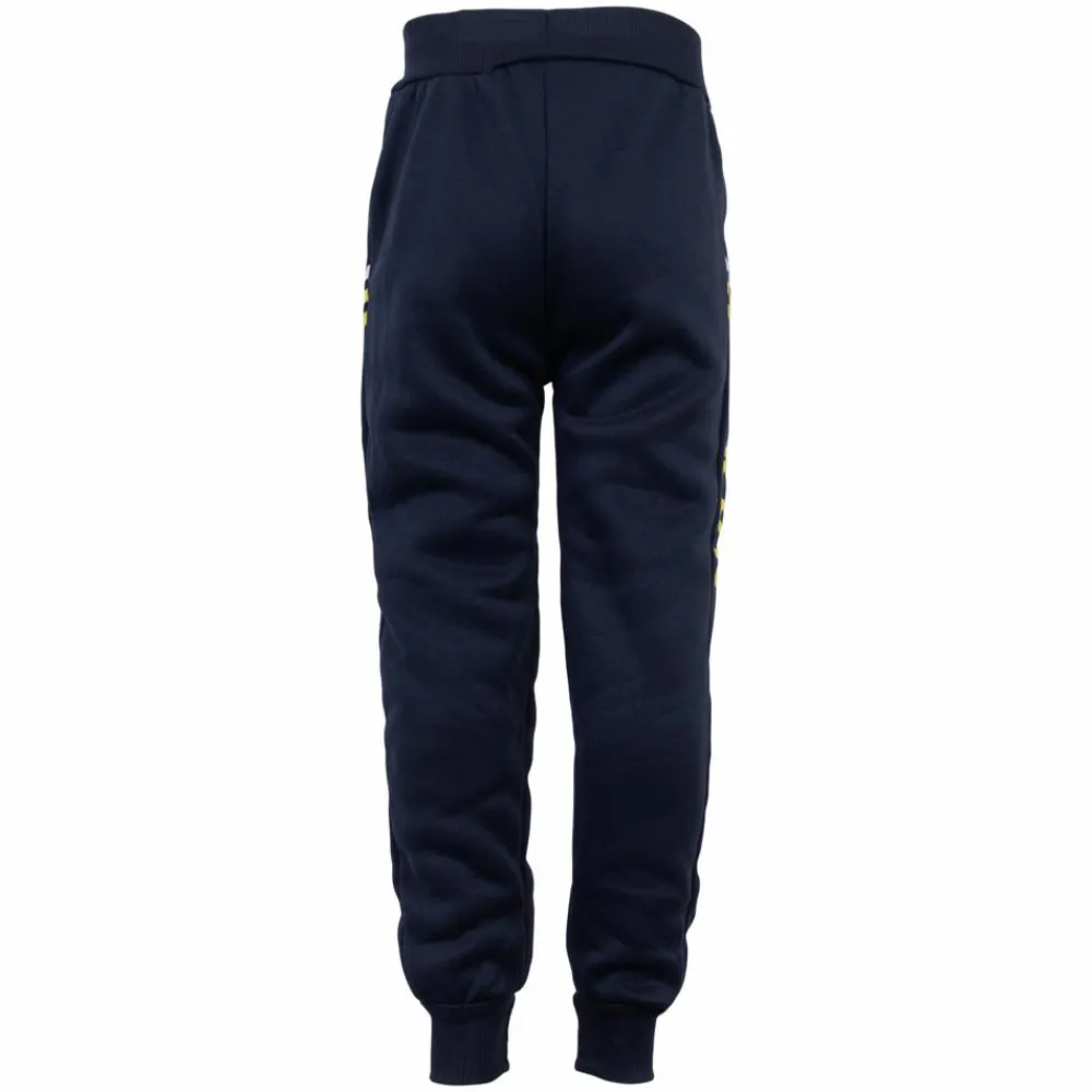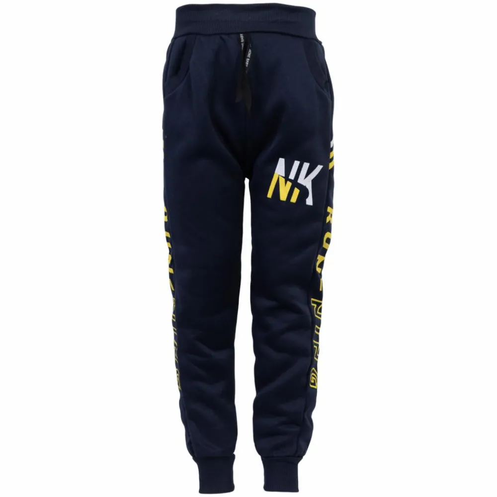 Børne joggingbukser med sidelommer. Bukserne har print ned langs siderne. Bukserne har elastik ribkant ved taljen og ved buksebenets afslutning. Bukserne har bindebånd ved taljen og en børstet inderside.