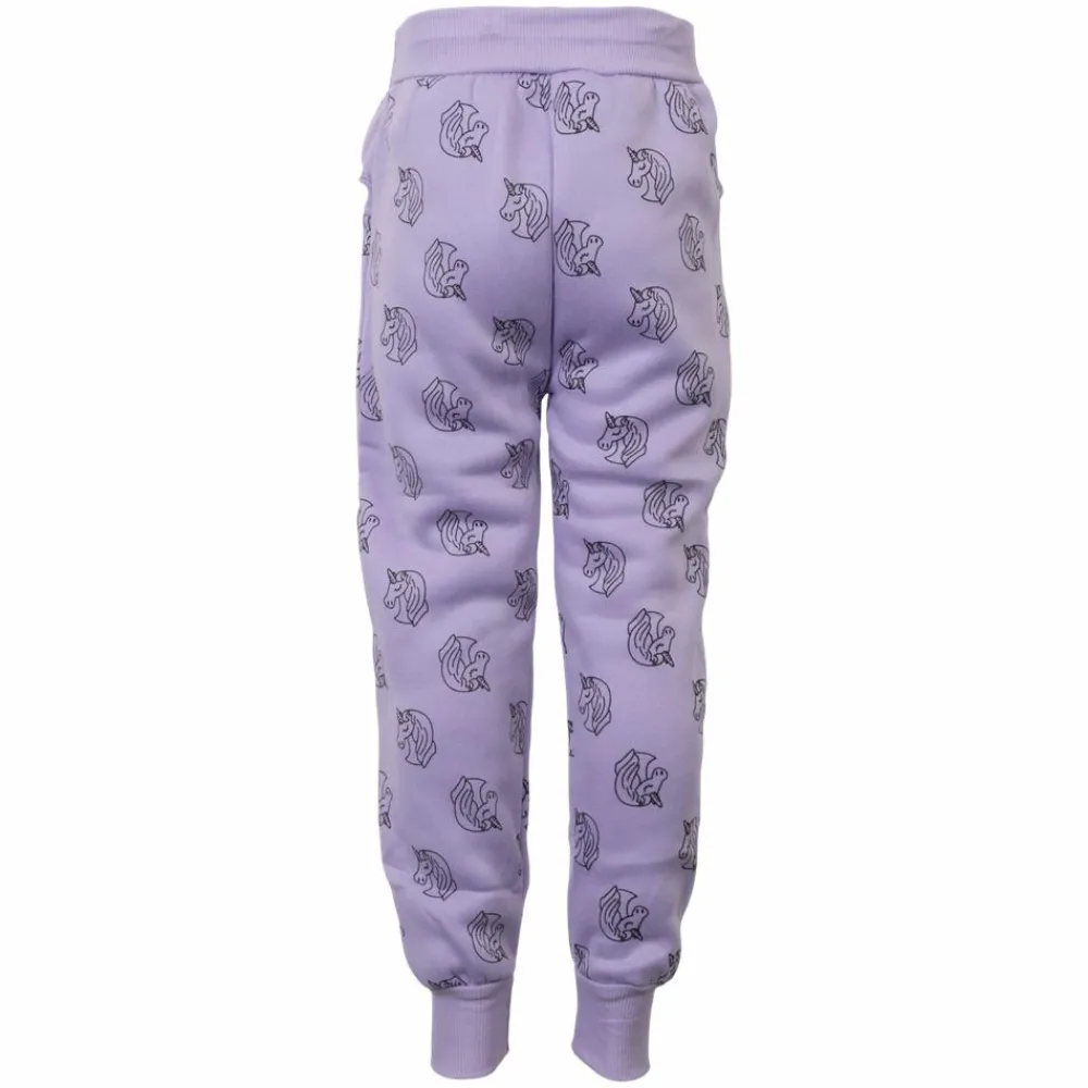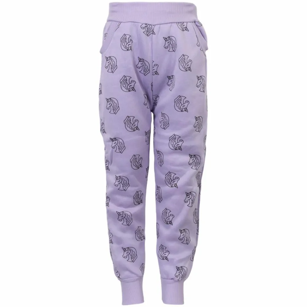 Den bløde lilla tone giver et roligt og legende udtryk, mens det fine enhjørningeprint sætter fantasien fri. Silhuetten er afslappet med elastisk talje og elastiske afslutninger ved anklerne, så bukserne bliver hvor de skal.