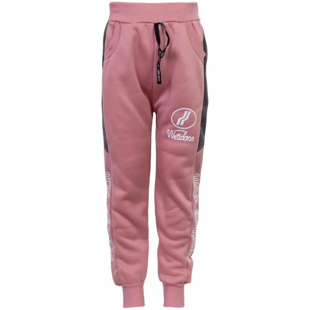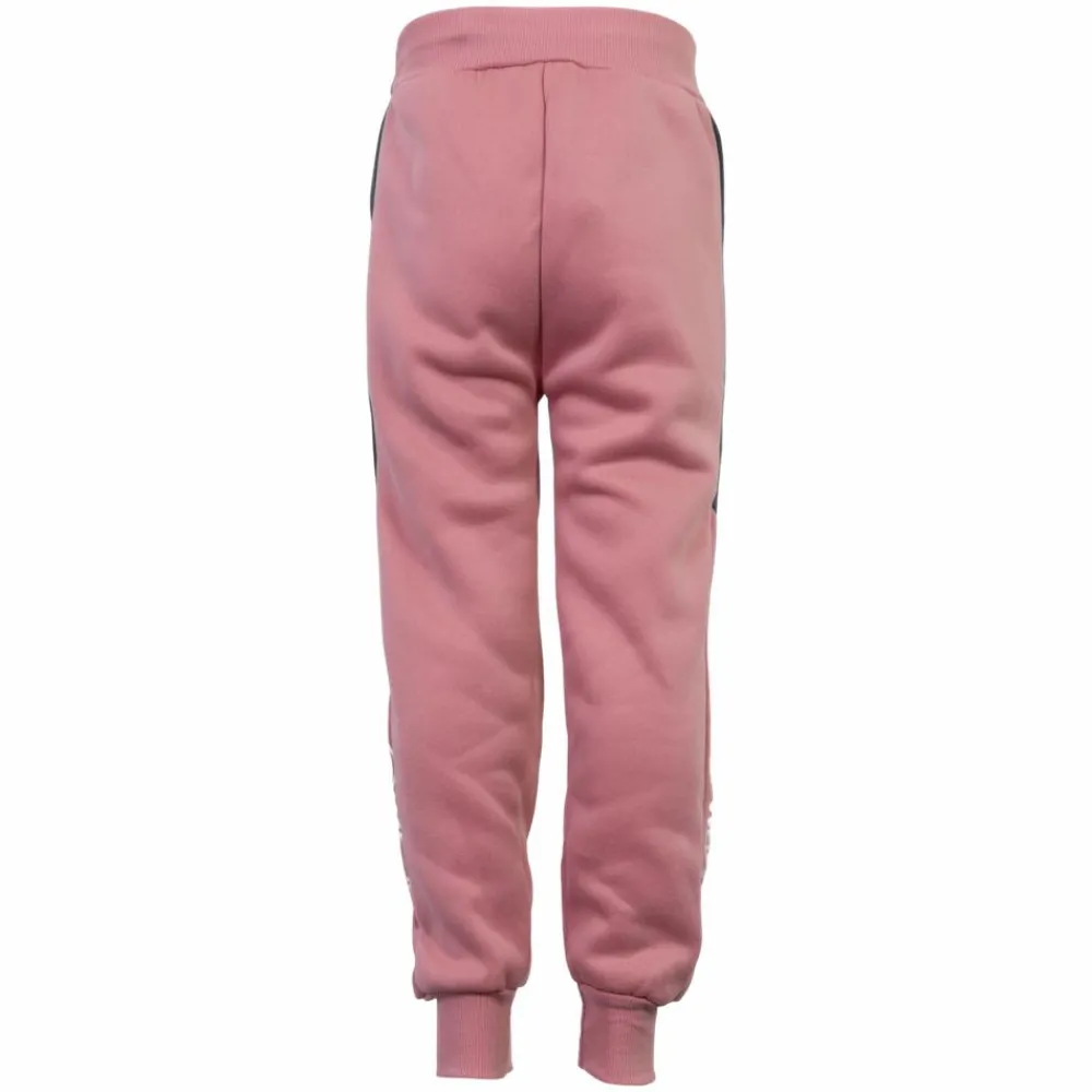Pige joggingbukser med børstet inderside. Bukserne har grå striber og print ned langs buksebenene. Bukserne har siddelommer og snøre ved taljen. Bukserne har elastikrib ved taljen og buksebenets afslutning.