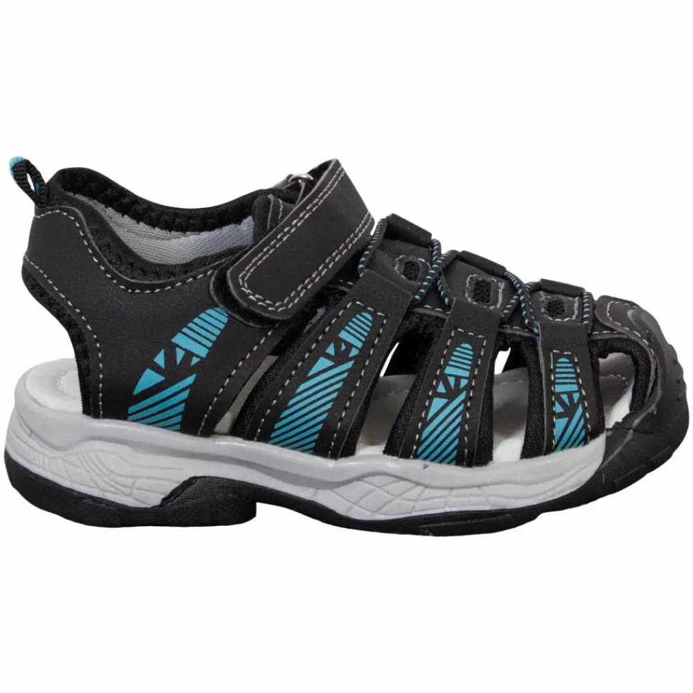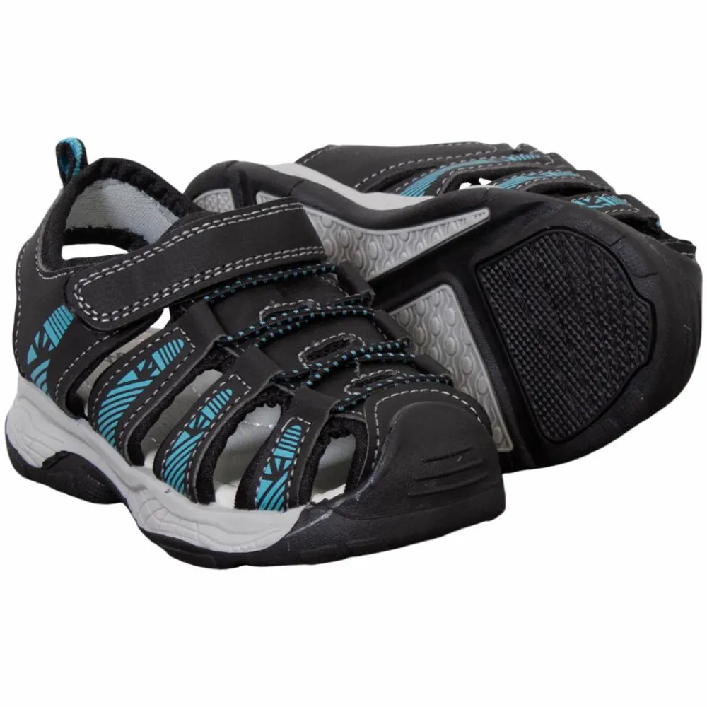 Børne sandaler med solid sål, lukket front med elastisk snøre og justerbar rem med velcrolukning.