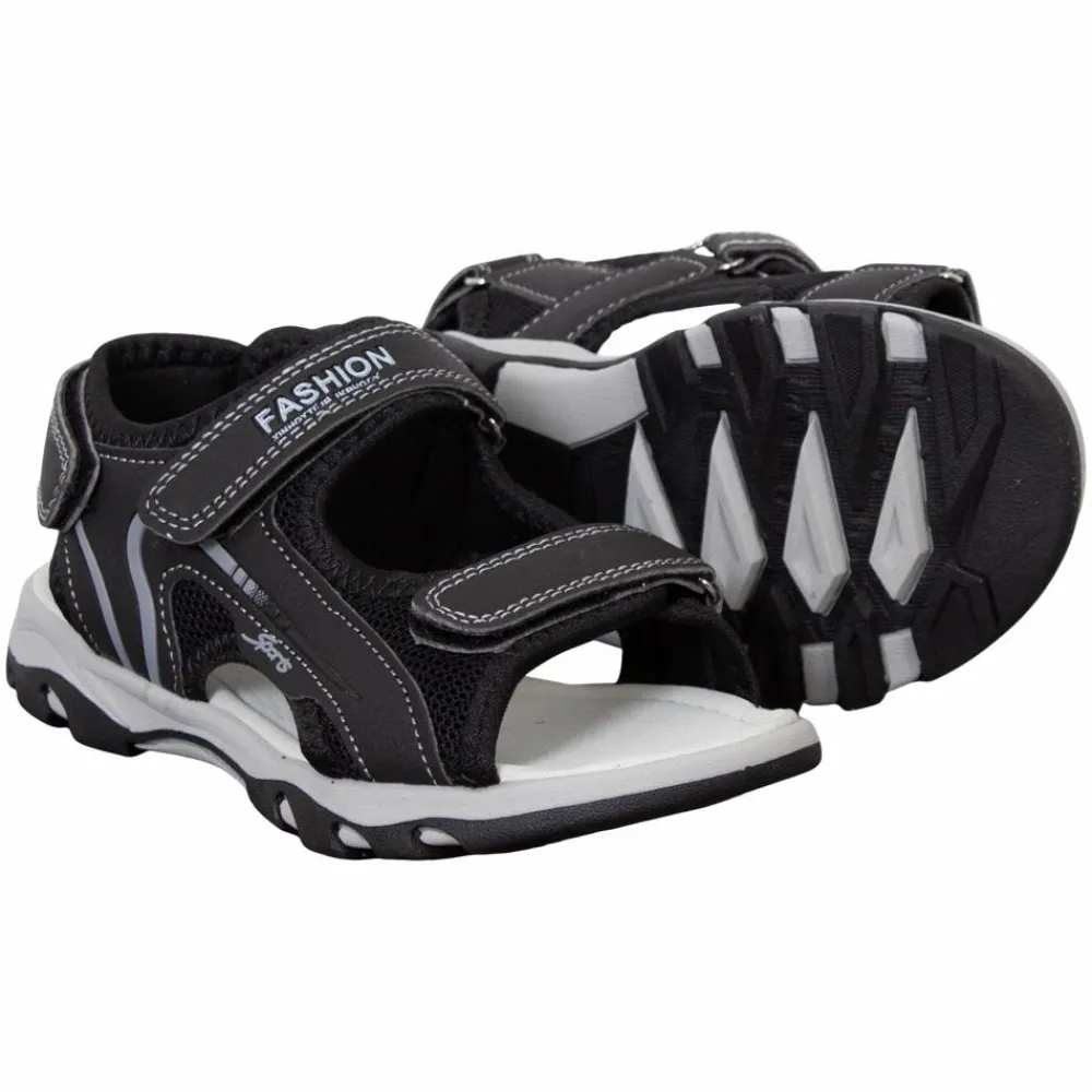 Børne sandaler med fleksibel sål, mesh overdel og tre justerbare remme med velcro – to henover foden og en ved hælen.