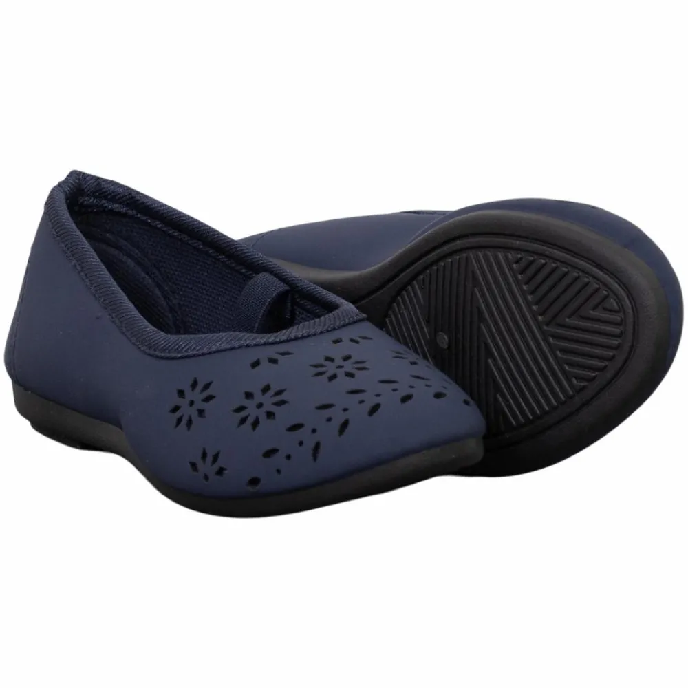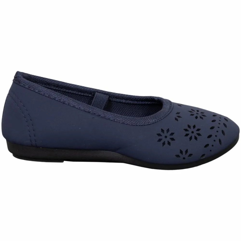 Fin ballerina sko til piger. Pigerne får komfort og stil med de flotte ballerina sko i et enkelt design med elegant dekorativ udskæring i blomsterform på fronten. Den elastiske rem over vristen sikrer en god pasform og en perfekt stabilitet, selv under leg og bevægelse. Pigeskoene er i et let og åndbart materiale og er ideel til både hverdag, i skole eller børnehave, og fest. Skoene har en blød indersål og en fast ydersål med flad riflet bund, som giver et godt fodfæste. Skoenes elastiske rem går det let at tage dem af og på.