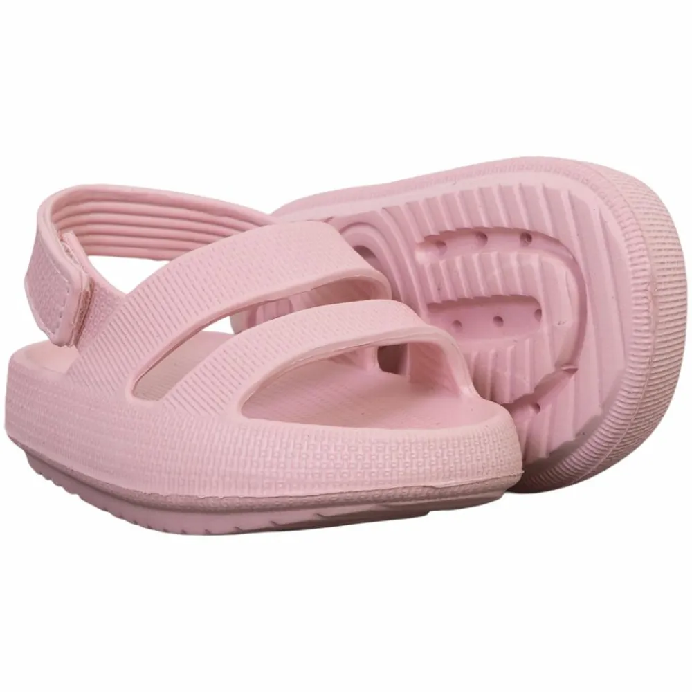 Anyway pige sandaler i ensfarvet lyserød. Sandalerne har to stropper over foden og en bag hælen. Sandalerne lukkes med en velcrolukning. Sandalerne har en mønstret ydersål, som giver et solidt greb og stabilitet på forskellige underlag.