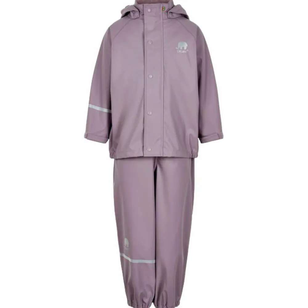 To delt regnsæt fra CeLaVi. Jakken har lynlås og vindstolpen lukkes med trykknapper. Regnbukserne har seler i str. 70-100 og har elastik i taljen i str. 110-140. Sættet er 100% vind- og vandtæt med et vandsøjletryk på 5000 mm. Den aftagelige hætte sidder fast med trykknapper rundt om halskraven, som er foret med dejligt blødt fleece, der holder halsen lun og tør. Ærmerne kan justeres ved håndleddet og i siderne er jakken designet med en elastikkant, som sikrer perfekt tilpasning til barnets krop. Regnbuksernes seler kan justeres og de lukkes med solide klikspænder. Ved hjælp af en trykknap i siderne er der mulighed for at justere bredden på bukserne. Regnbukserne har en smal elastik og ved anklerne er der en justérbar strop, som kan sættes under fodtøjet, så man sikrer at regnbukserne ikke kravler op. Der er flere fine refleksdetaljer på både regnjakke og regnbukser.
