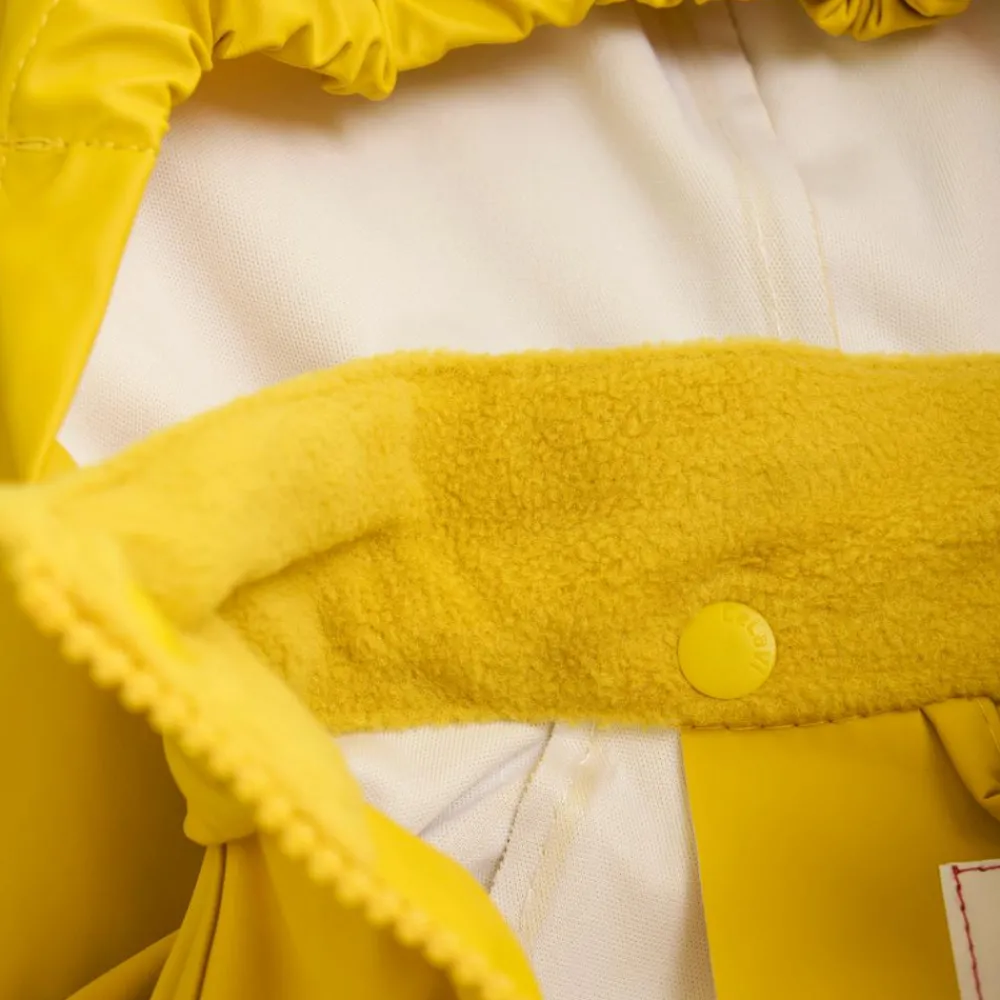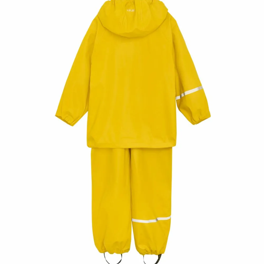 To delt regnsæt fra CeLaVi. Jakken har lynlås og vindstolpen lukkes med trykknapper. Regnbukserne har seler i str. 70-100 og har elastik i taljen i str. 110-140. Sættet er 100% vind- og vandtæt med et vandsøjletryk på 5000 mm. Den aftagelige hætte sidder fast med trykknapper rundt om halskraven, som er foret med dejligt blødt fleece, der holder halsen lun og tør. Ærmerne kan justeres ved håndleddet og i siderne er jakken designet med en elastikkant, som sikrer perfekt tilpasning til barnets krop. Regnbuksernes seler kan justeres og de lukkes med solide klikspænder. Ved hjælp af en trykknap i siderne er der mulighed for at justere bredden på bukserne. Regnbukserne har en smal elastik og ved anklerne er der en justérbar strop, som kan sættes under fodtøjet, så man sikrer at regnbukserne ikke kravler op. Der er flere fine refleksdetaljer på både regnjakke og regnbukser.