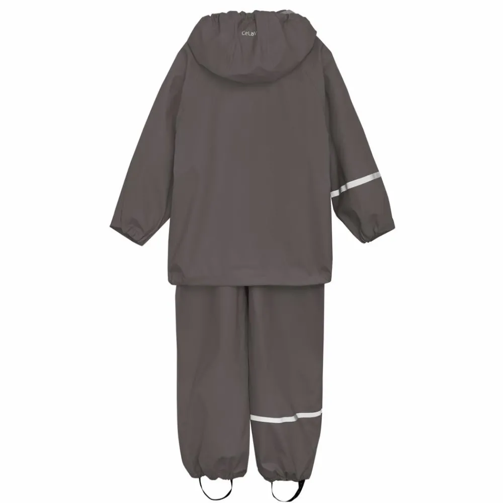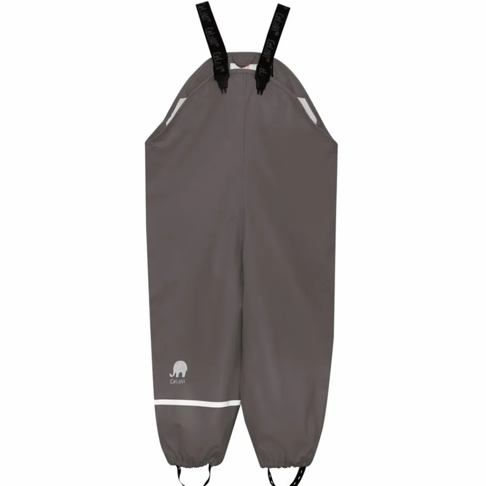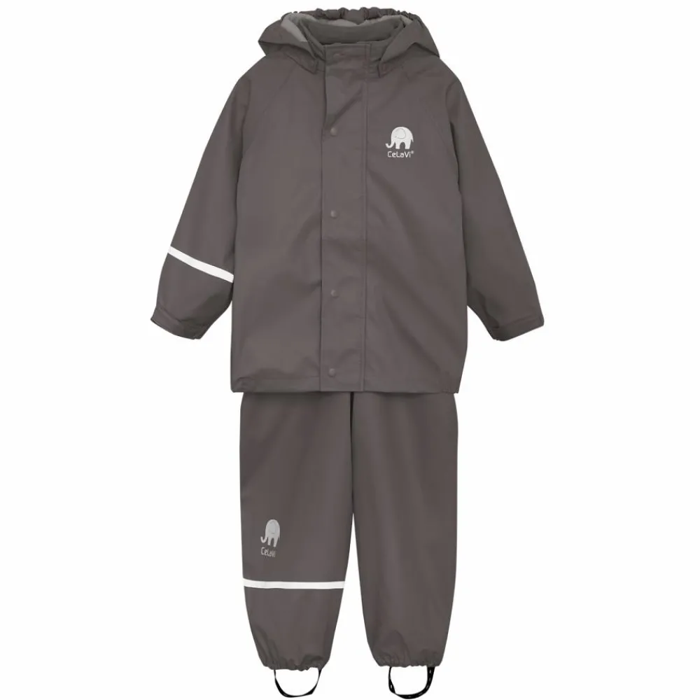 To delt regnsæt fra CeLaVi. Jakken har lynlås og vindstolpen lukkes med trykknapper. Regnbukserne har seler i str. 70-100 og har elastik i taljen i str. 110-140. Sættet er 100% vind- og vandtæt med et vandsøjletryk på 5000 mm. Den aftagelige hætte sidder fast med trykknapper rundt om halskraven, som er foret med dejligt blødt fleece, der holder halsen lun og tør. Ærmerne kan justeres ved håndleddet og i siderne er jakken designet med en elastikkant, som sikrer perfekt tilpasning til barnets krop. Regnbuksernes seler kan justeres og de lukkes med solide klikspænder. Ved hjælp af en trykknap i siderne er der mulighed for at justere bredden på bukserne. Regnbukserne har en smal elastik og ved anklerne er der en justérbar strop, som kan sættes under fodtøjet, så man sikrer at regnbukserne ikke kravler op. Der er flere fine refleksdetaljer på både regnjakke og regnbukser.