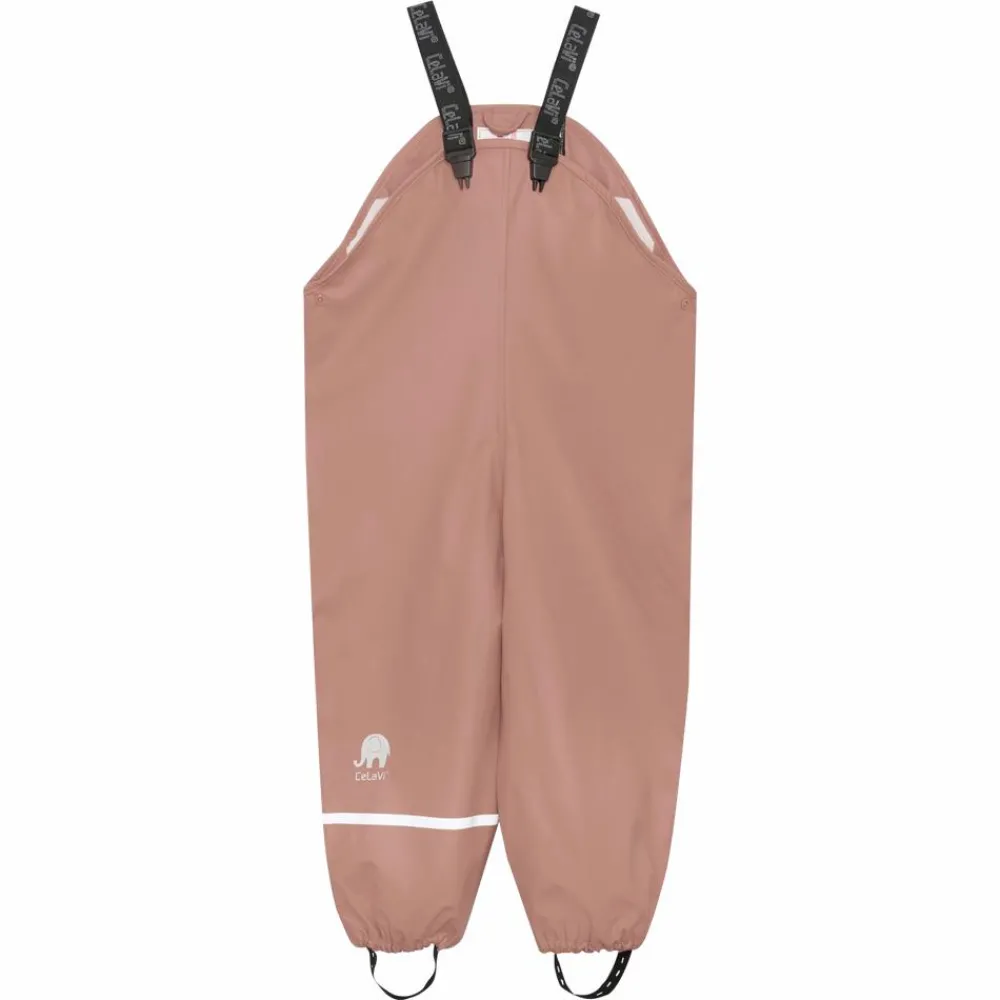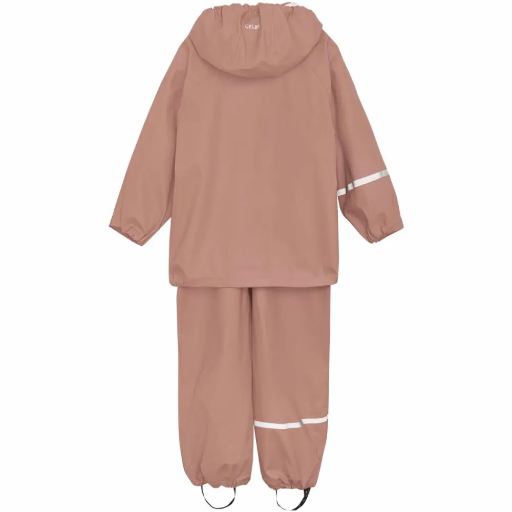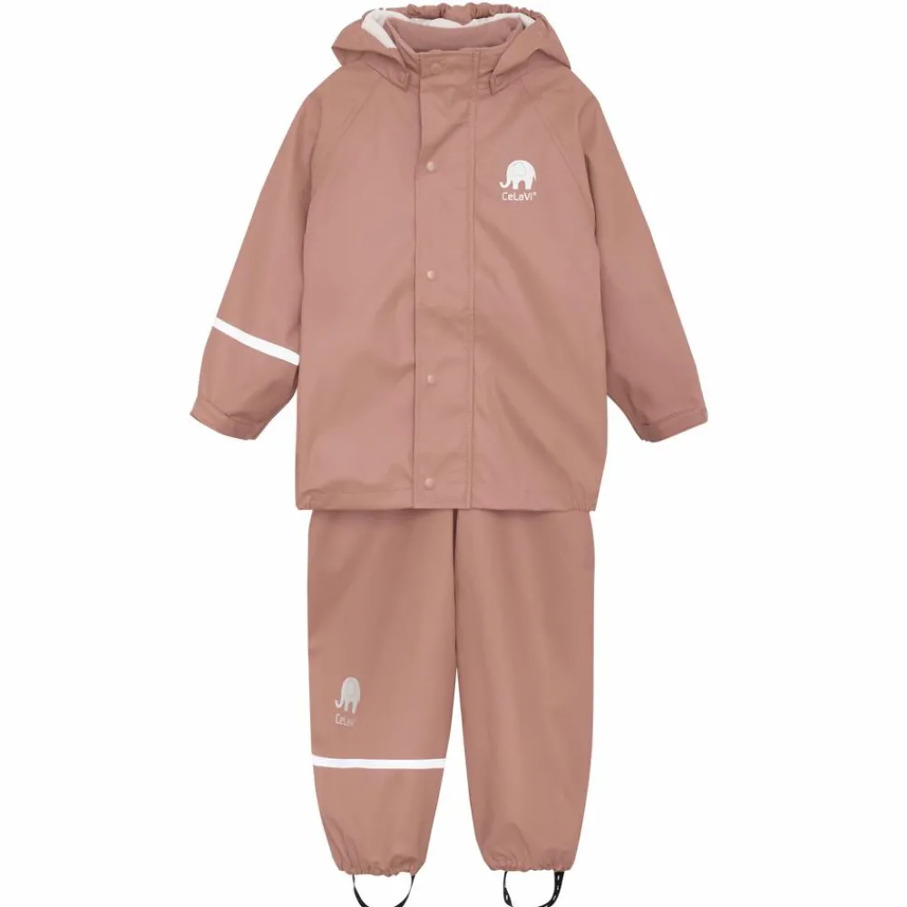 To delt regnsæt fra CeLaVi. Jakken har lynlås og vindstolpen lukkes med trykknapper. Regnbukserne har seler i str. 70-100 og har elastik i taljen i str. 110-140. Sættet er 100% vind- og vandtæt med et vandsøjletryk på 5000 mm. Den aftagelige hætte sidder fast med trykknapper rundt om halskraven, som er foret med dejligt blødt fleece, der holder halsen lun og tør. Ærmerne kan justeres ved håndleddet og i siderne er jakken designet med en elastikkant, som sikrer perfekt tilpasning til barnets krop. Regnbuksernes seler kan justeres og de lukkes med solide klikspænder. Ved hjælp af en trykknap i siderne er der mulighed for at justere bredden på bukserne. Regnbukserne har en smal elastik og ved anklerne er der en justérbar strop, som kan sættes under fodtøjet, så man sikrer at regnbukserne ikke kravler op. Der er flere fine refleksdetaljer på både regnjakke og regnbukser.