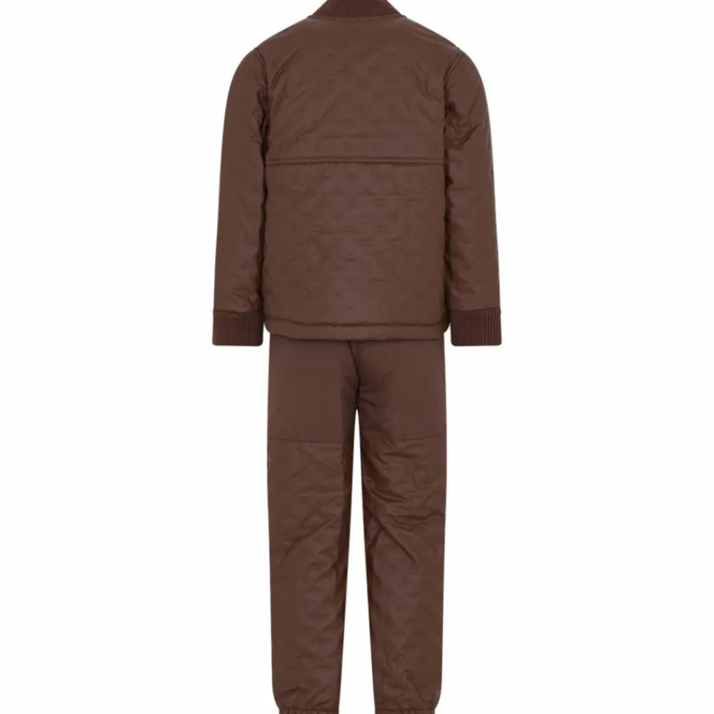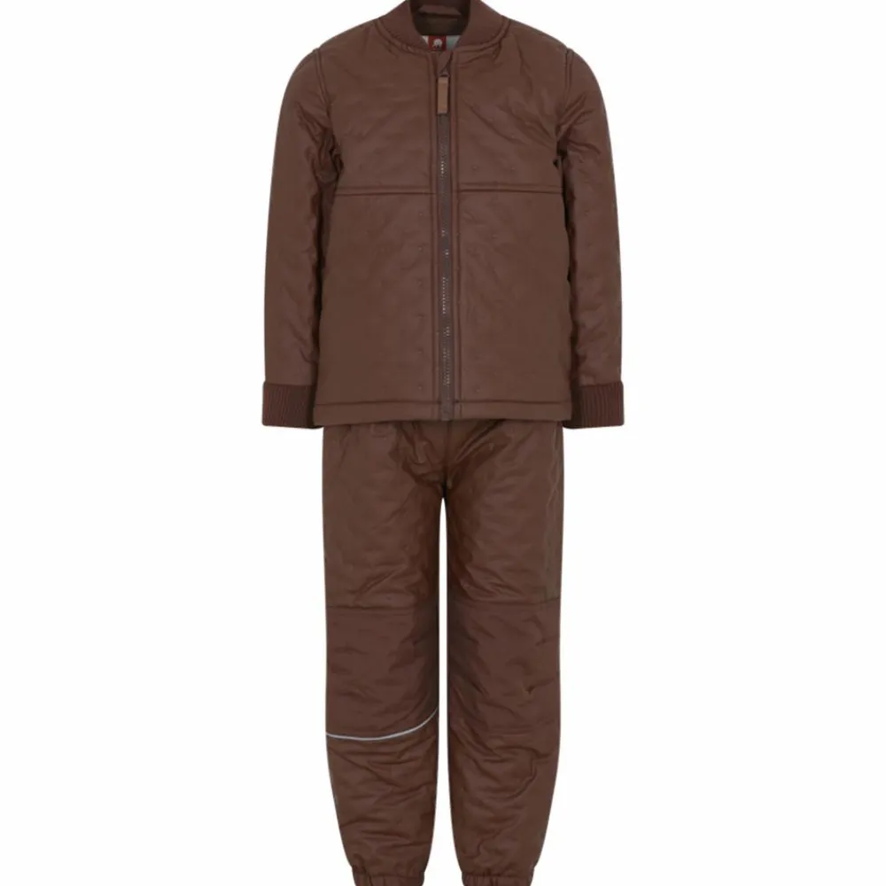 Termosæt med PU overflade og indvendig fleece foring. Jakken har gennemgående lynlåslukning med hagebeskytter, CeLaVi logo og en blød ribkant ved hals og ærmegab. Bukserne har forstærkning på knæ og numse samt elastik i taljen og anklerne. Bukserne har en praktisk refleksstribe, som giver ekstra sikkerhed, når børnene færdes udenfor i mørket. Uundværligt termosæt med PU coating som gør både termojakke og termobukser vandafvisende og vindtæt.