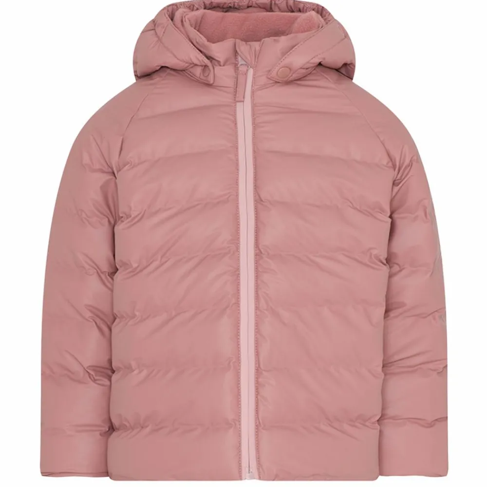 CeLaVi børne vandtæt dynjakke med aftagelig hætte via trykknapper. Hætten og kraven har fleece for. Jakken har gennemgående lynlåslukning med vindstopper samt hagebeskytter. Ærmerne har snefang med ribkant og under ærmerne er der små ventilationshuller.