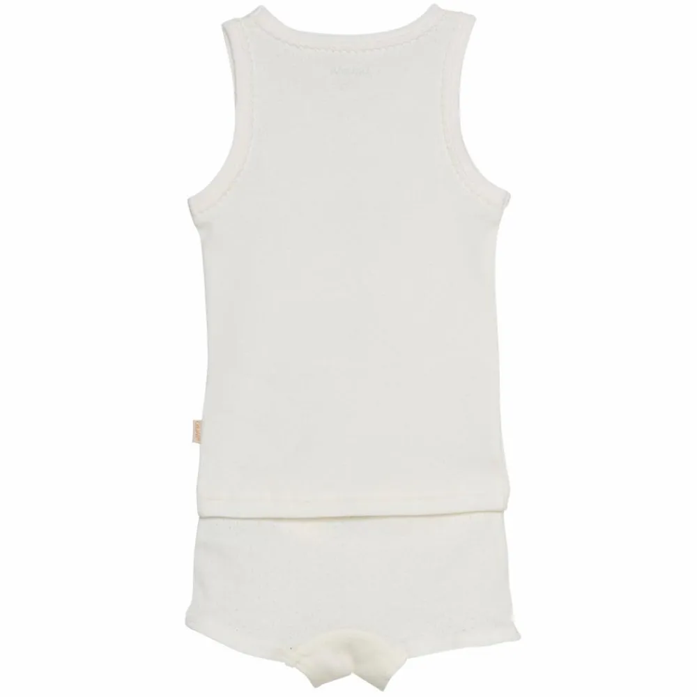 Undertøjs-sæt af 2 stykker tøj bestående af en tank top og et par underbukser. Begge styk tøj er ensfarvet og lavet af blødt bomuld. Underbukserne har elastik i taljen og i bunden.