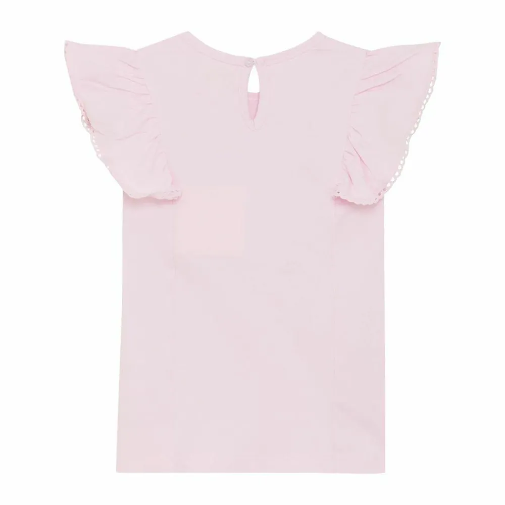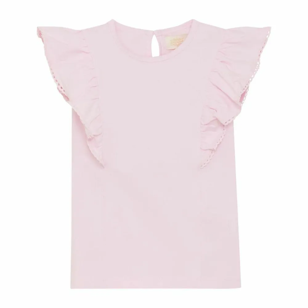 Denne bluse til piger forener en blid rose pink nuance med et let udtryk. Rund hals, nøglehul med knap i nakken og korte flæseærmer med fin perforeret kant giver et charmerende twist til både skole og weekend. Se flere bluser og sweatshirts.