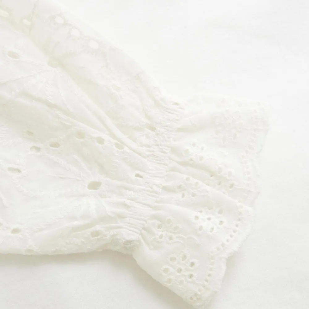 Yndig bluse fra Creamie. Blusen har pointelle hals og ærmer, hvilket giver et let, luftigt og feminint udtryk Den er med rynkeeffekt ved ærme- og halsudskæring. Kroppen er holdt i blødt bomuld.