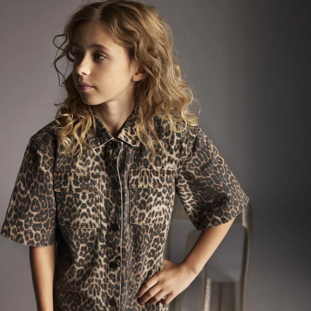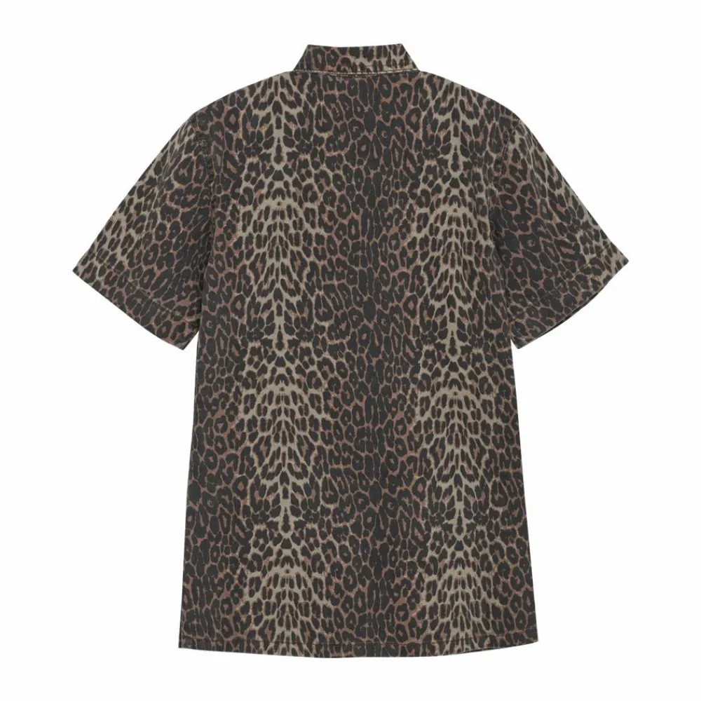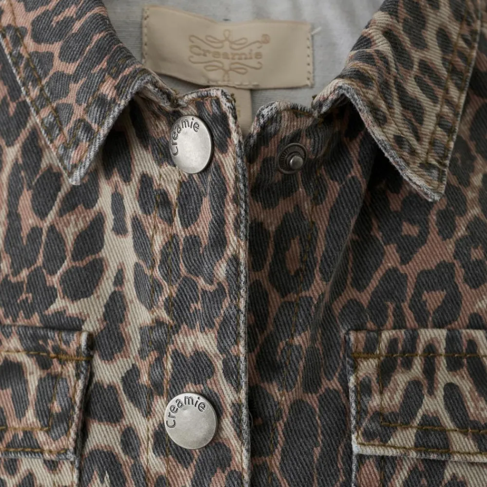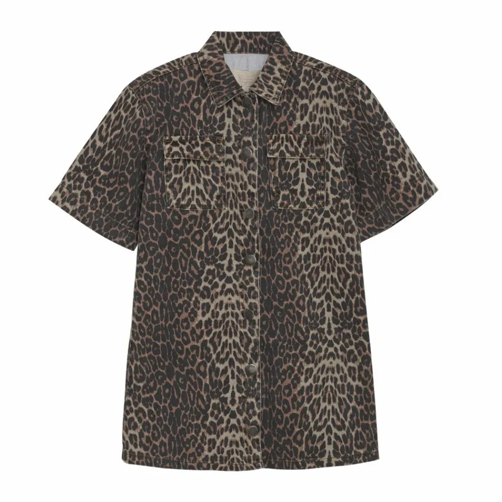Creamie denimkjole i leoprint. Kjolen har gennemgående trykknapper, korte ærmer med vidde og to brystlommer.