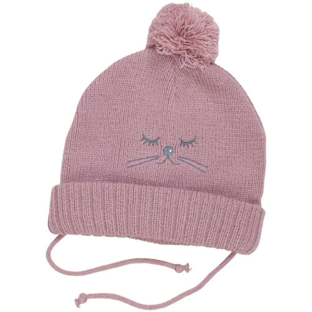Crossbow baby beanie m. pompom. Super blød beanie til børn, som har print på. Beanien har pompomer på toppen af hovedet, og stropper til at stramme op omkring halsen. Beanien har ribkant ved panden.