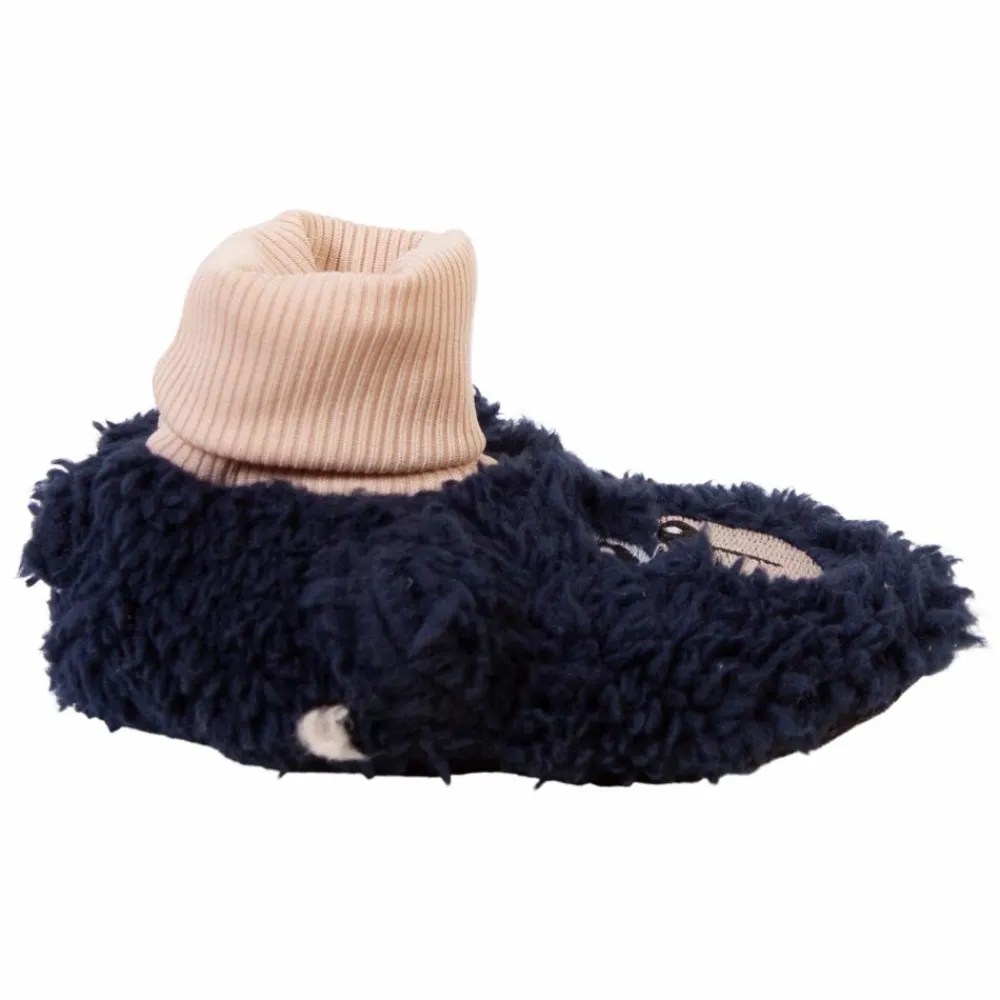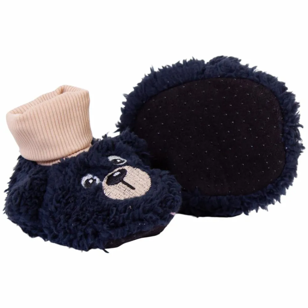 Crossbow bløde baby hjemmesko. Bløde hjemmesko til baby med ribkant rundt om anklen. Bunden er lavet i skridsikkert materiale, så baby bedre kan stå fast og tager på samme tid noget af kulden fra gulvet. Hjemmeskoen virker nærmest som en ekstra strømpe og der er et bjørneansigt på hjemmeskoenes forende.