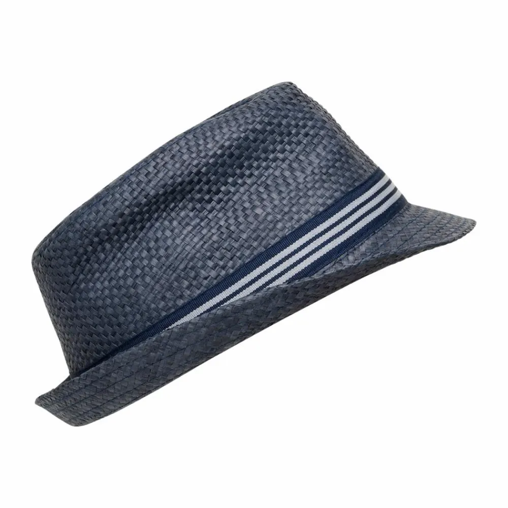 Hat med bånd og skygge hele vejen rundt. Hatten er lavet i et strikket mønster.
