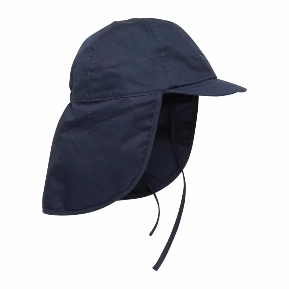 En Fant børne solhat. Smart sommerhue med praktisk kasketskærm og lang skygge bagpå. Elastik på baghovedet og snore under hagen sikrer, at hatten sidder godt på barnets hoved.