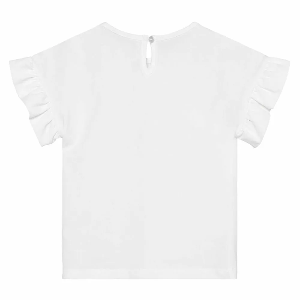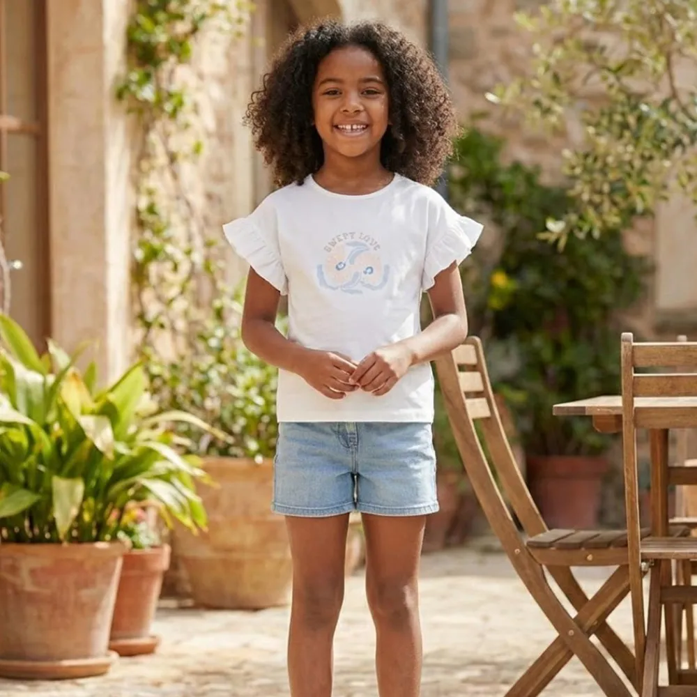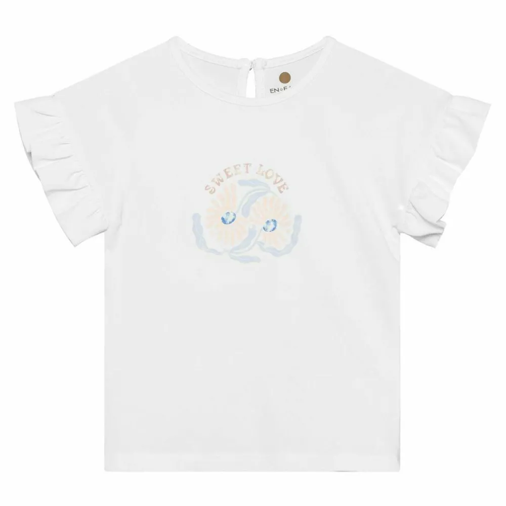 En let overdel i egret med korte rynkeærmer og rund hals giver et venligt udtryk og masser af bevægelsesfrihed. Det blide blomsterprint på fronten og den lille knap i nakken gør den både fin og praktisk til piger i alle aldre.