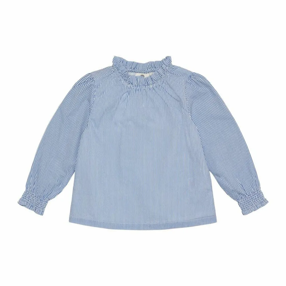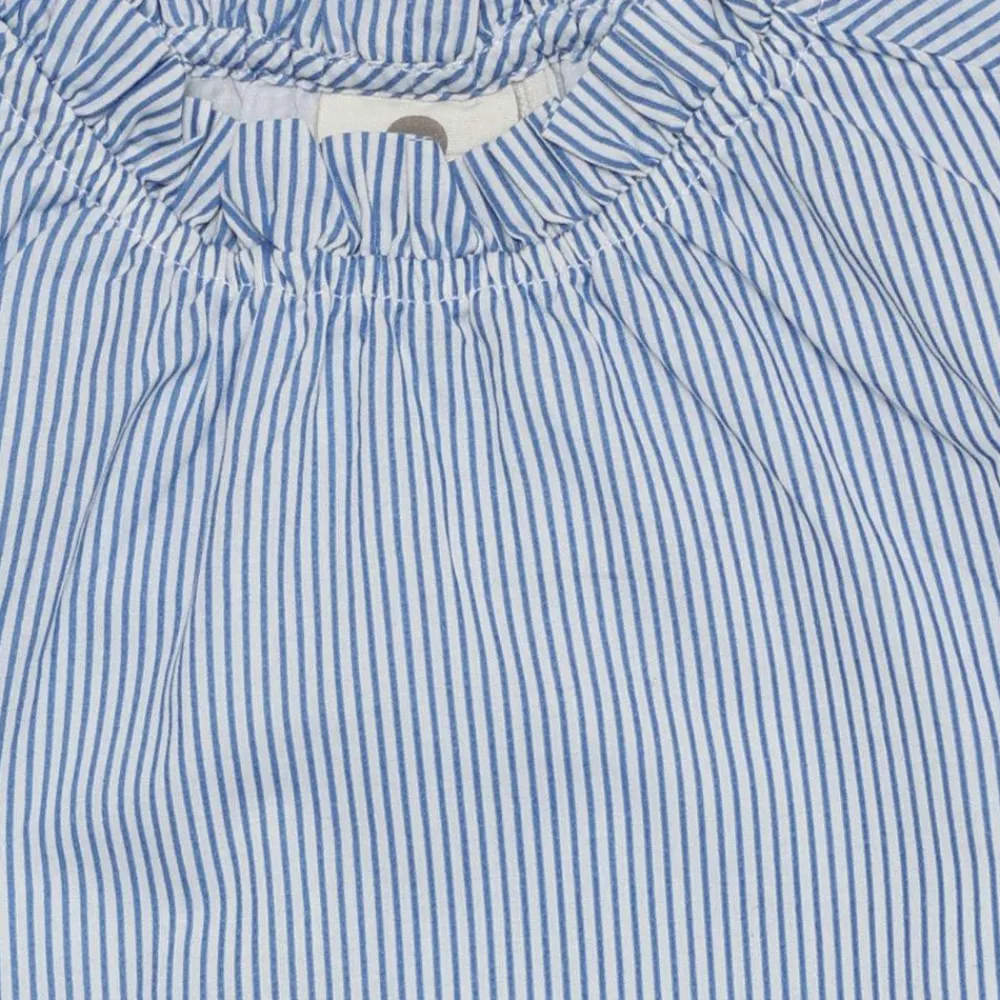 Et let udtryk med fine blå-hvide striber i regatta-nuancen sætter en lys tone. Den bløde, rynkede halskant rammer ansigtet pænt, og de lange ærmer afsluttes med elastiske manchetter, der holder formen uden at stramme. Den afslappede pasform falder naturligt og giver plads til leg og bevægelse i hverdagen.