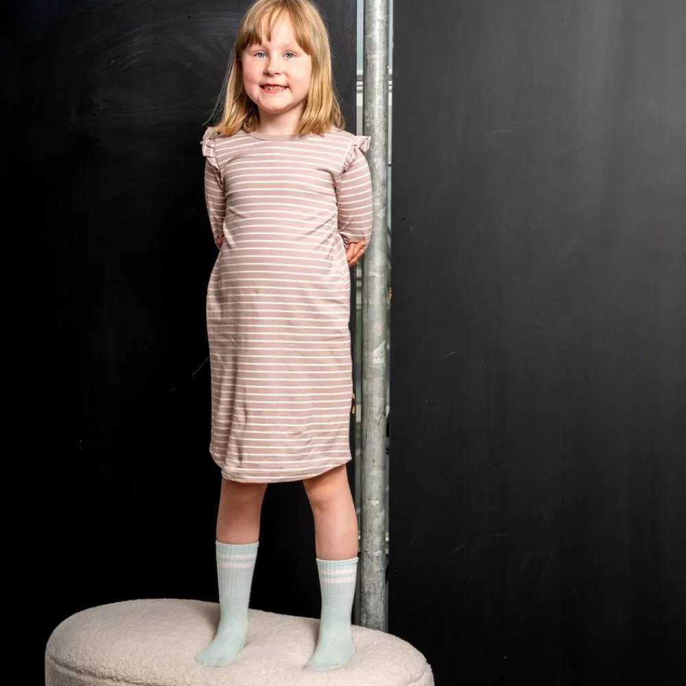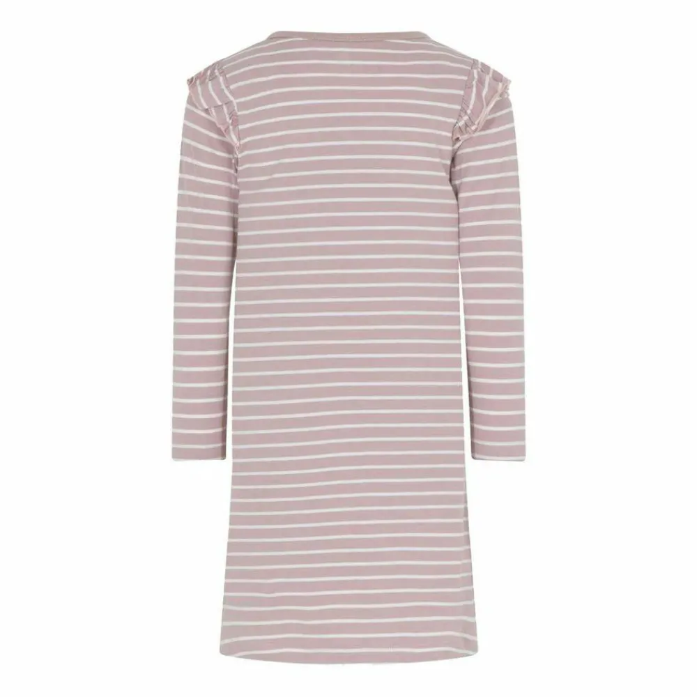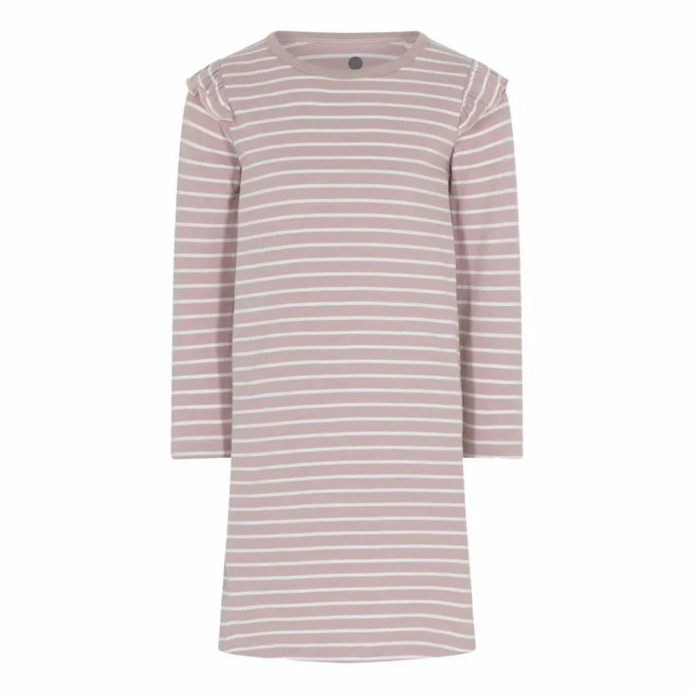 En Fant pige kjole med økologisk bomuld. Fin kjole med lange ærmer, rund halsudskæring og vandrette striber. På skuldrene er der de fineste flæser og kjoler er skåret i A-snit, hvor den fra armhulen og ned svajer en smule udad.