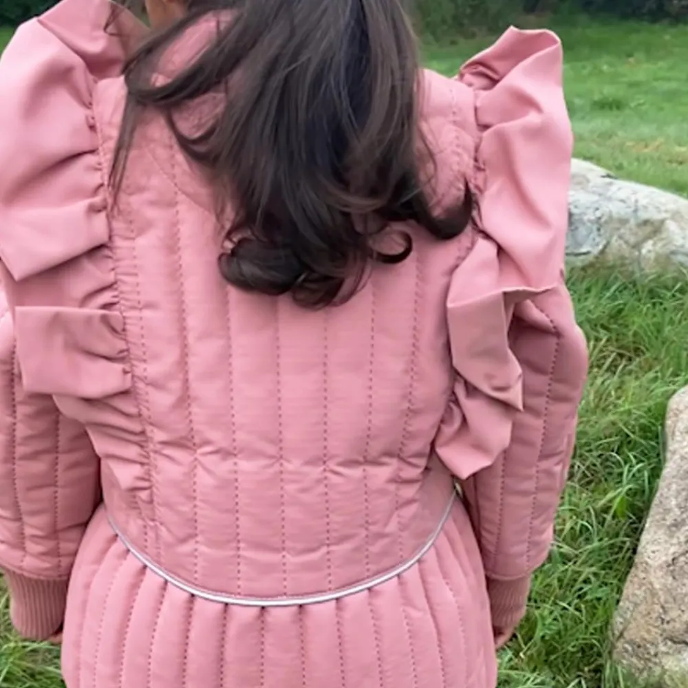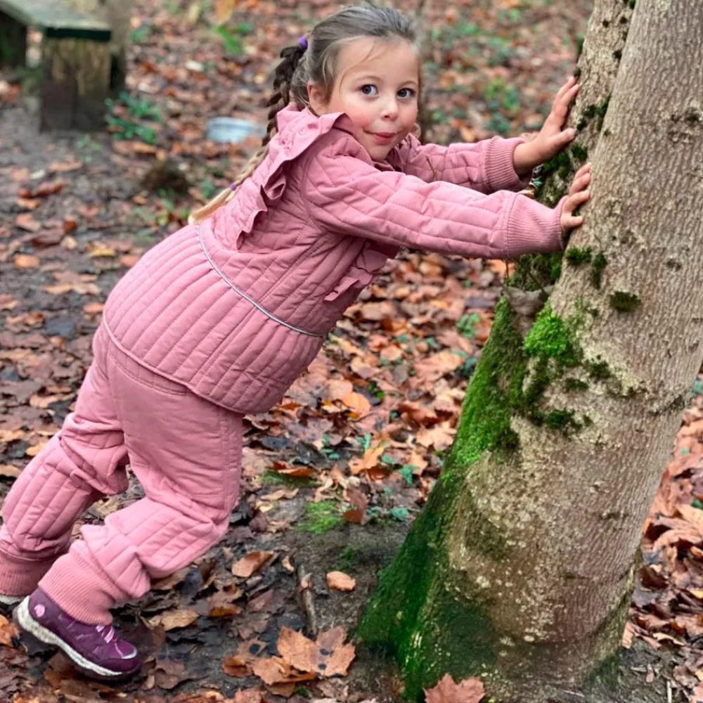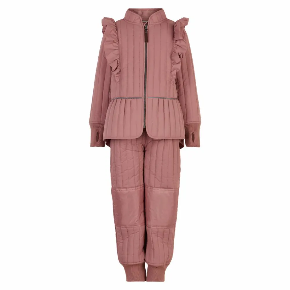 En Fant pige termosæt. Todelt sæt bestående af en termojakke samt et par termobukser. Termojakken har super fine detaljer som flæser henover skuldrene og et flot snit i taljen med en smal refleks. I ærmerne er der en bred ribkant med åbning til tommelfinger. Jakken har lynlåslukning. Bukserne matcher jakken og er ekstra slidstærk på bagdelen samt knæene. I buksebenene er der en bred ribkant og på indersiden i taljen kan bukserne justeres strammere.