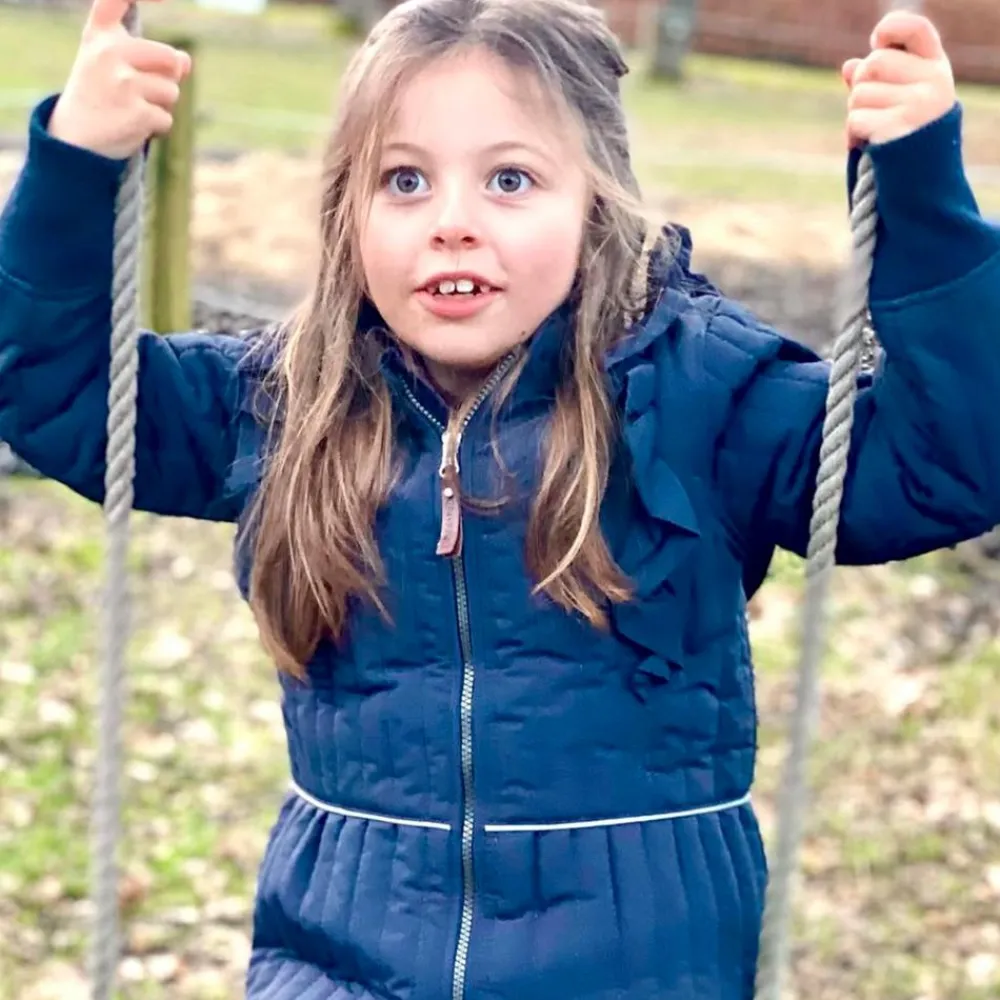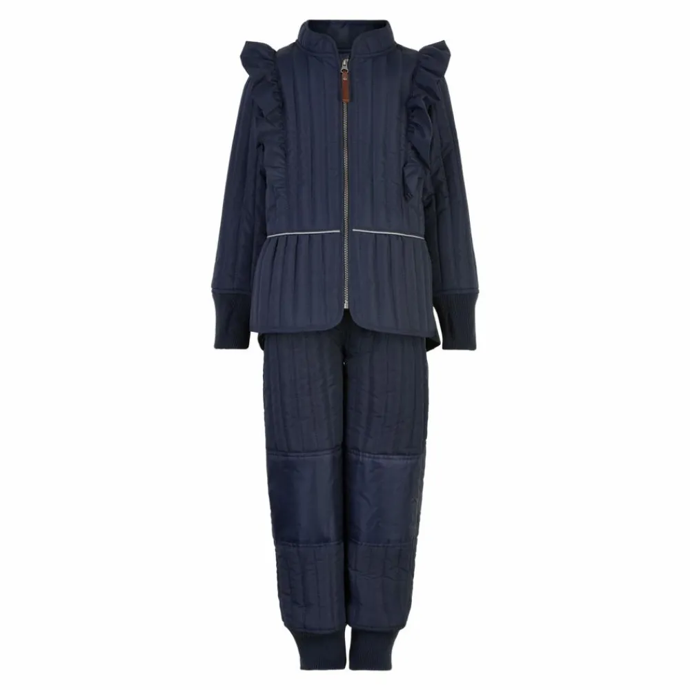 En Fant pige termosæt. Todelt sæt bestående af en termojakke samt et par termobukser. Termojakken har super fine detaljer som flæser henover skuldrene og et flot snit i taljen med en smal refleks. I ærmerne er der en bred ribkant med åbning til tommelfinger. Jakken har lynlåslukning. Bukserne matcher jakken og er ekstra slidstærk på bagdelen samt knæene. I buksebenene er der en bred ribkant og på indersiden i taljen kan bukserne justeres strammere.