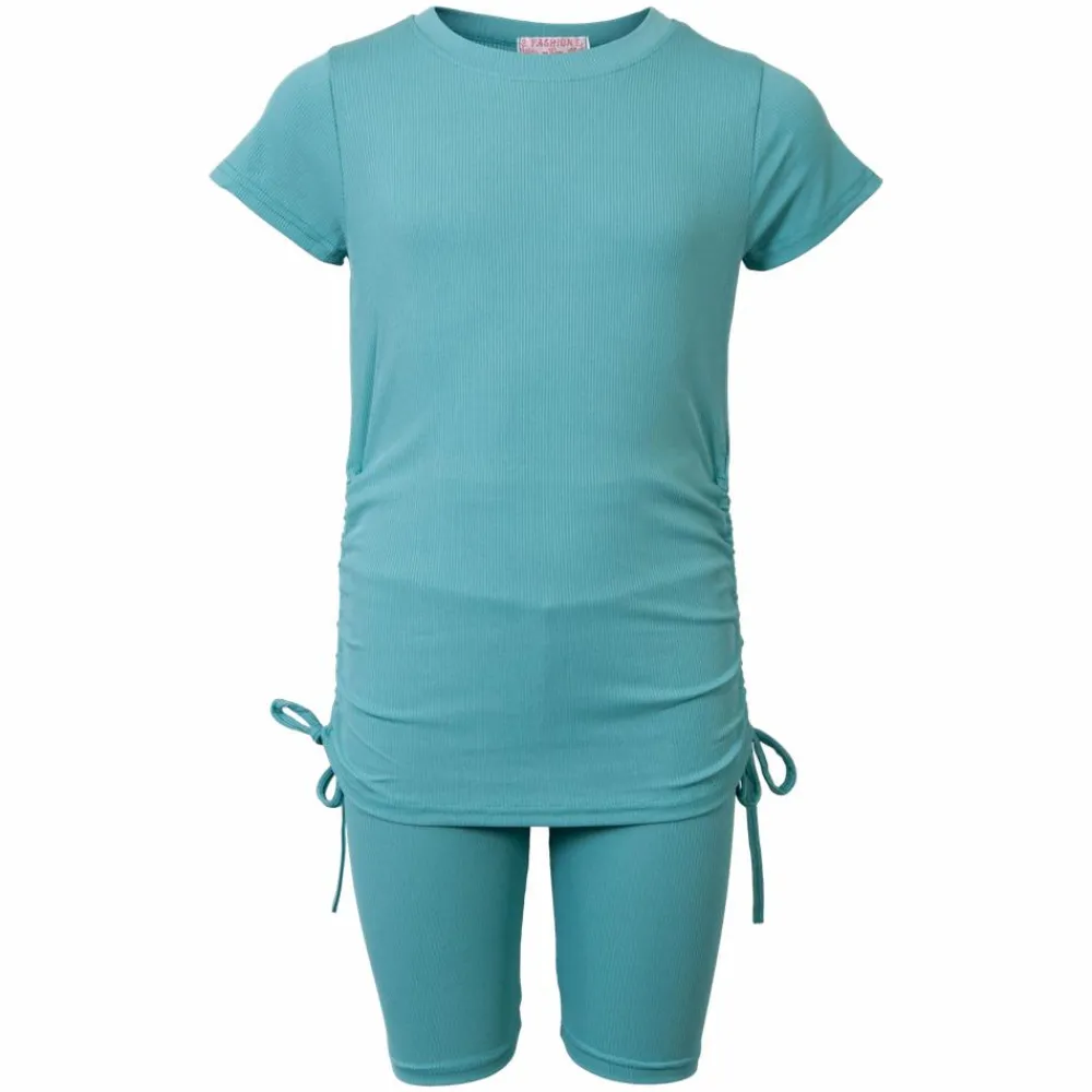 Fint pige shortssæt med t-shirt og korte leggings. T-shirten har korte ærmer og rund hals. Overdelen har fine detaljer i siden med bindebånd.
