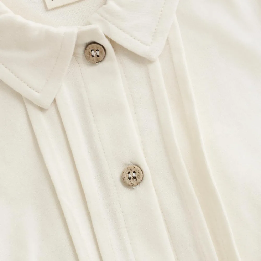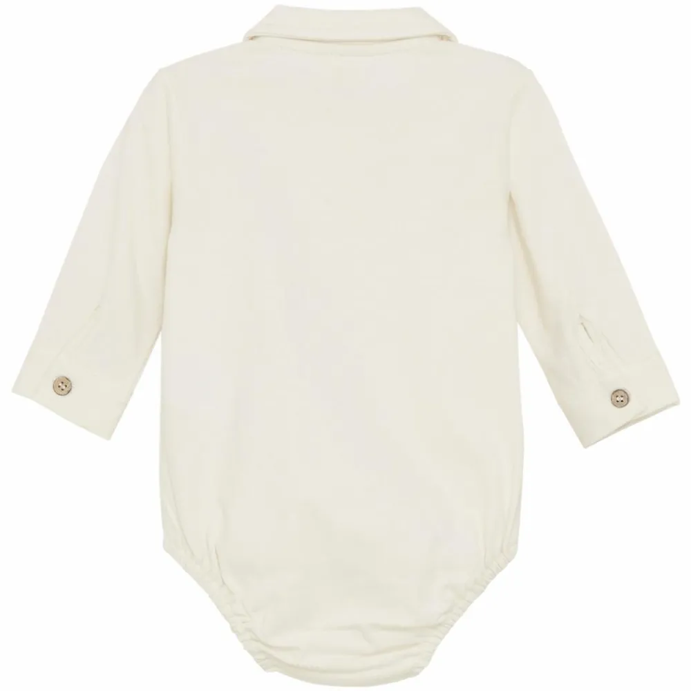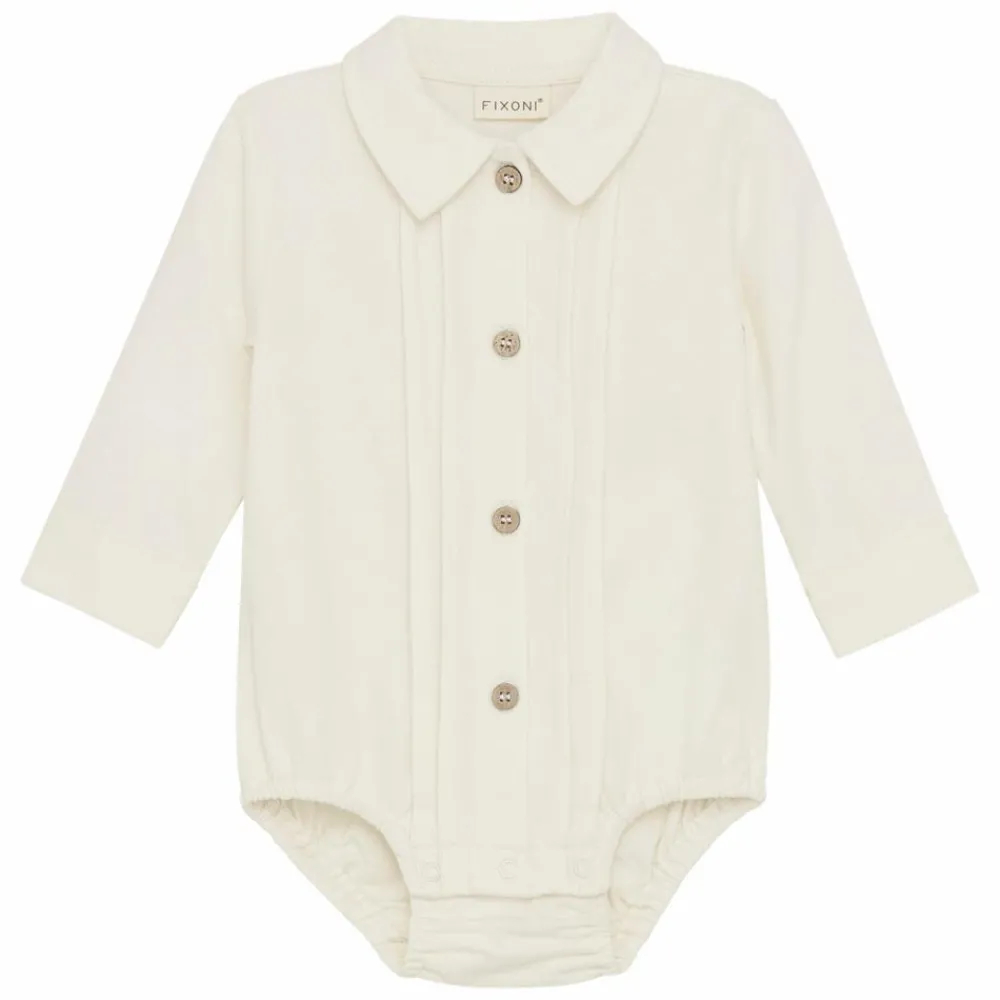 Fixoni langærmet bodystocking. Denne body har mange fine detaljer og er designet som en skjorte med krave og knappelukning på fronten og ved håndled. Bodyen har praktiske trykknapper i bunden, som gør det let og enkelt at skifte ble.