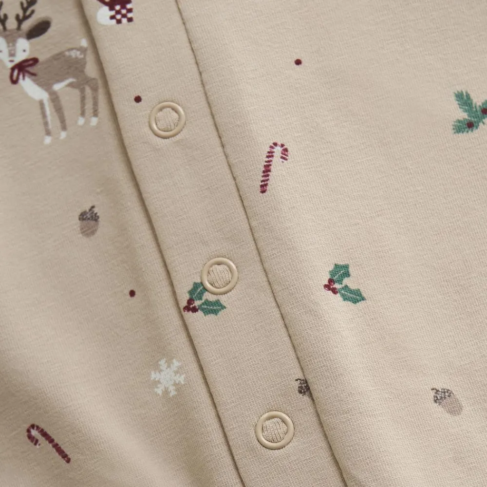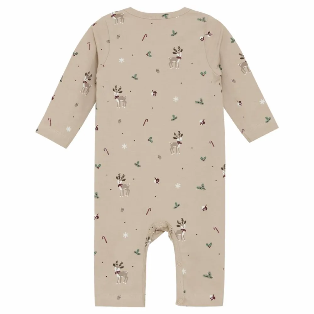 Fixoni heldragt designet med det fineste julemotiv. Babydragten har et fint all-over-print, som virkelig skaber julestemning. Heldragten til de små har en praktisk trykknappelukning foran, samt langs benenes inderside. Det gøre det let at få dragten af og på, samt at skifte bleen, uden at skulle tage alt tøjet af barnet.