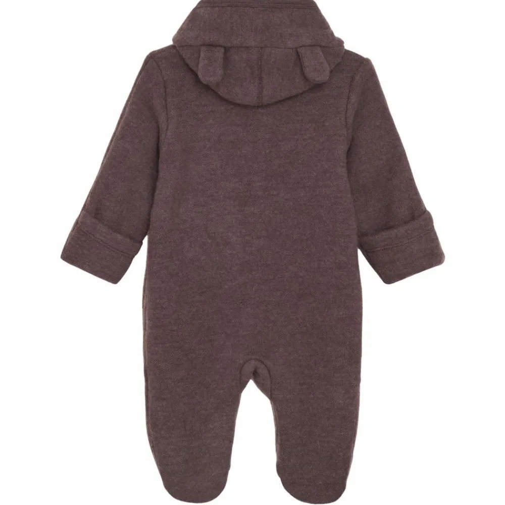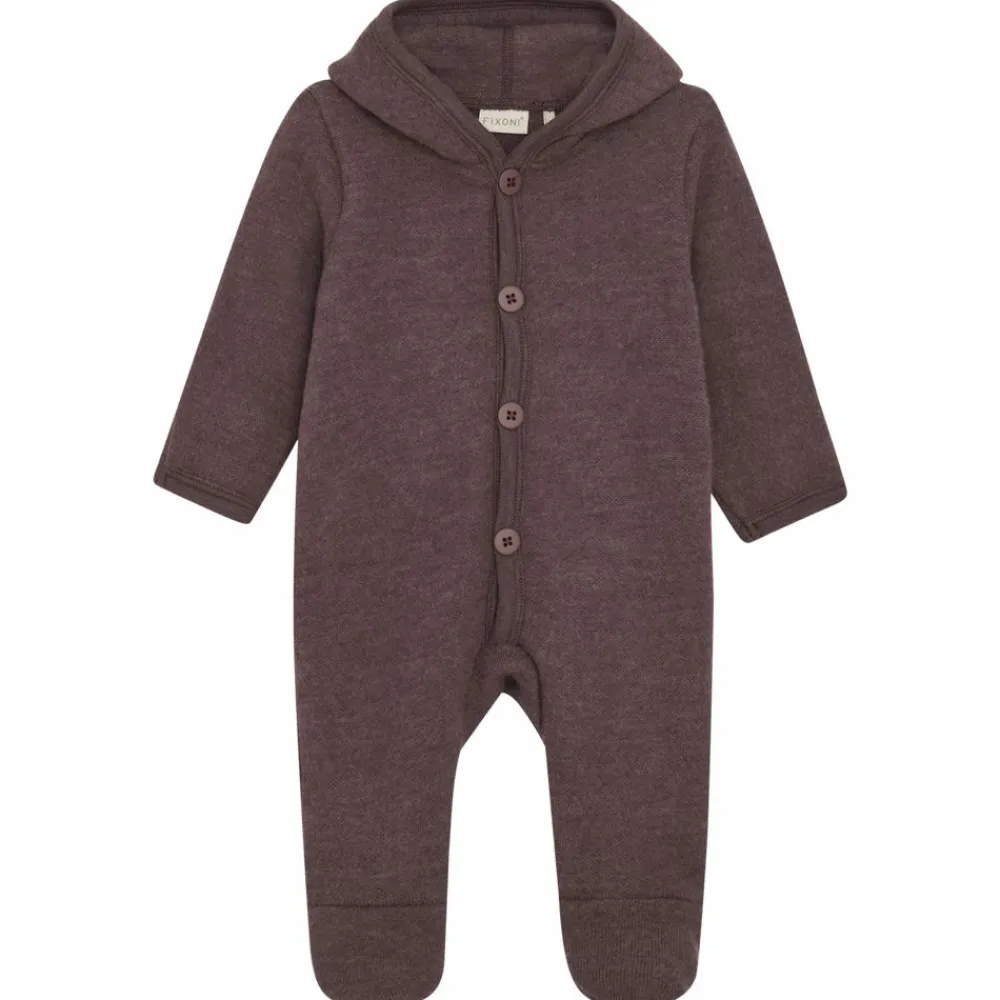 Fixoni blød heldragt i blødbørstet merino uld. Dragten har en hætte med påsyede ører og gennemgående knaplukning. Den lækre køredragt har lange ærmer med et praktisk ombuk ved hænderne, så der kan lukkes af for kulde og vind. Ulddragten er lukket ved fødderne, så de holdes dejligt lune.