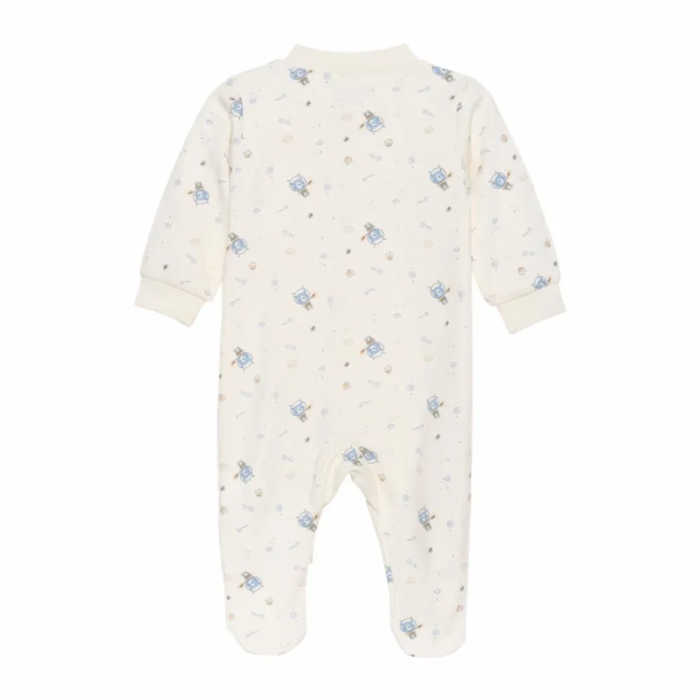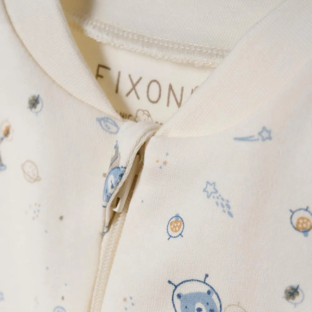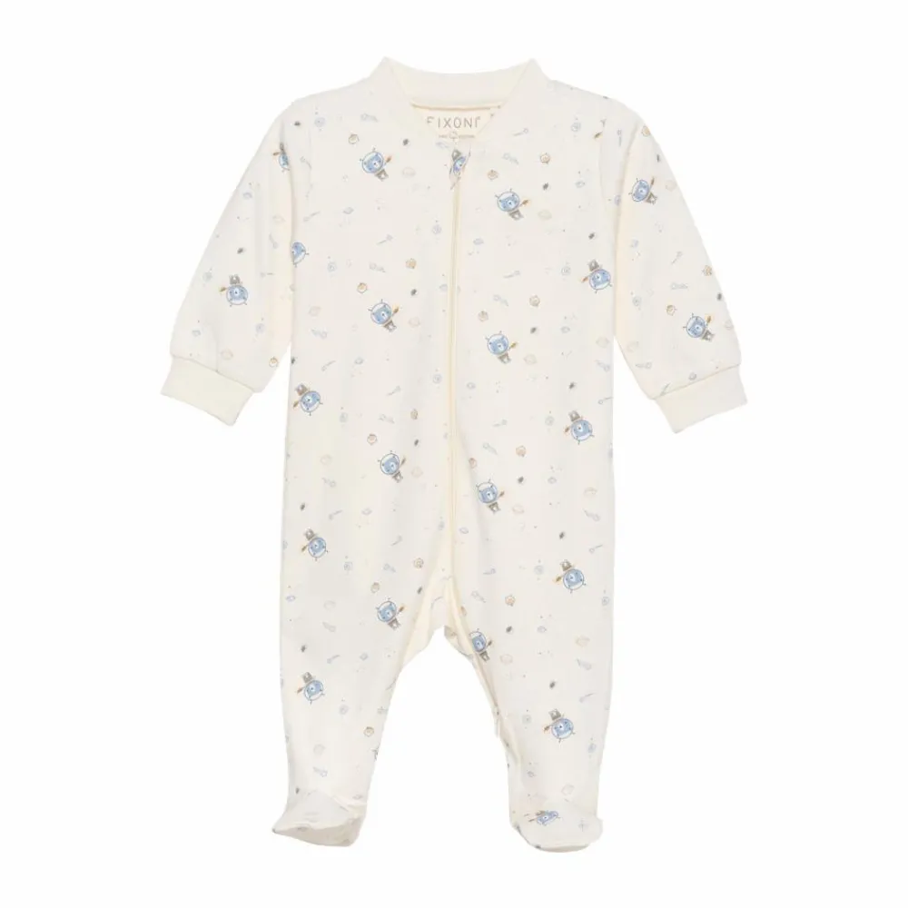 Fixoni heldragt til de små. Natdragt med påsyede fødder. Natdragten lukkes med lynlås fra halsen ned til anklen. Dragten er lavet af økologisk bomuld.