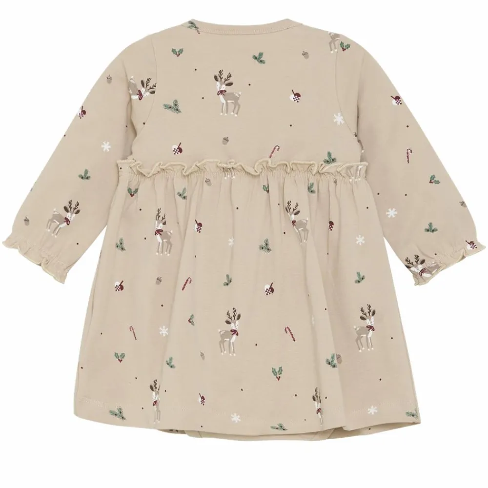 Fixoni pige baby bodystocking kjole. Julekjolen der er fin, flot, blød og behagelig. Kjolen er designet med en praktisk og smart indvendig body, samt knapper ved skulderne. Kjolen har et fint jule all-over print, samt en skæring på tværs med en fin flæsekant både foran og bagpå.