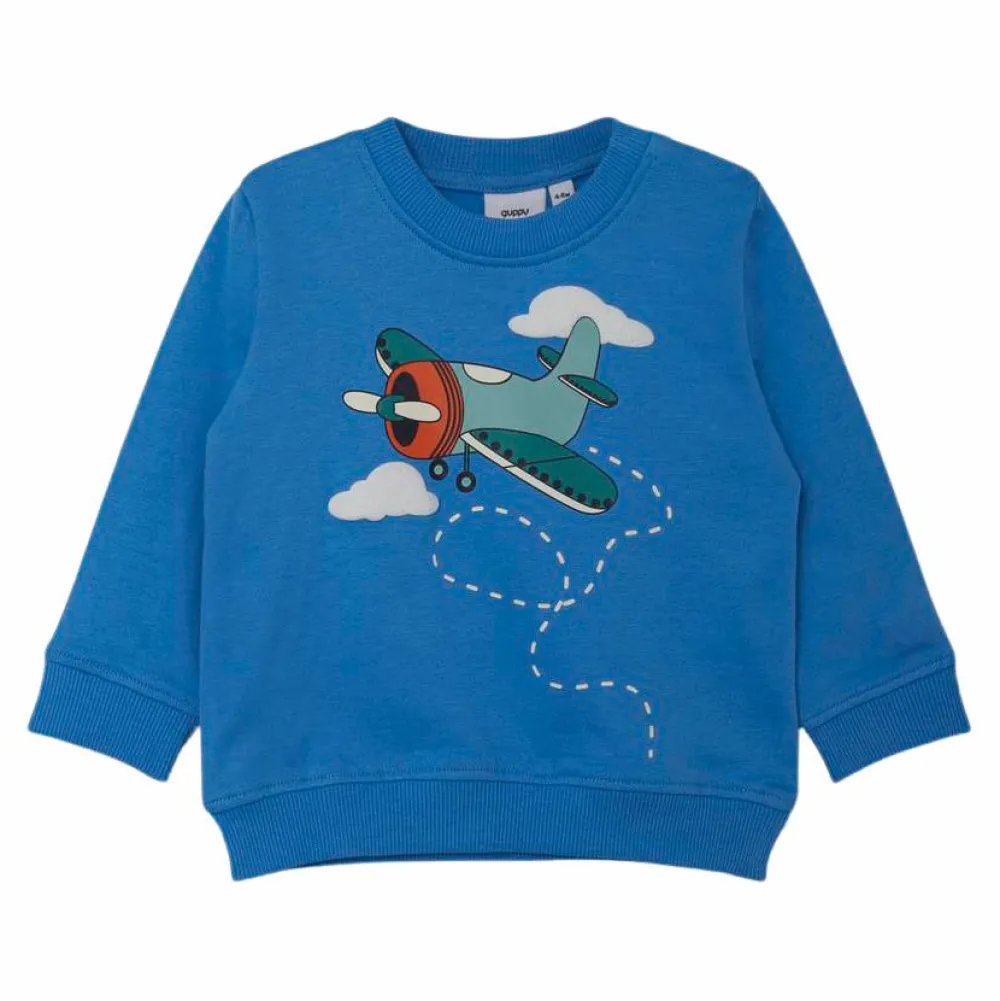 Guppy børne sweatshirt. Sweatshirten har print op fronten, samt rund halsudskæring. Trøjen har ribkant om halsen, ærmerne og i bunden. Sweatshirten har 2 trykknapper ved venstre skulder.