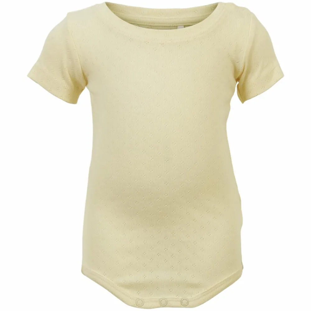 Guppy baby pige bodystocking. Bodystockingen har gennemgående mønster, samt rund halsudskæring med 2 knapper ved venstre skulder, samt 3 knapper i bunden. Bodystockingen har ribkant om halsen og om benene.