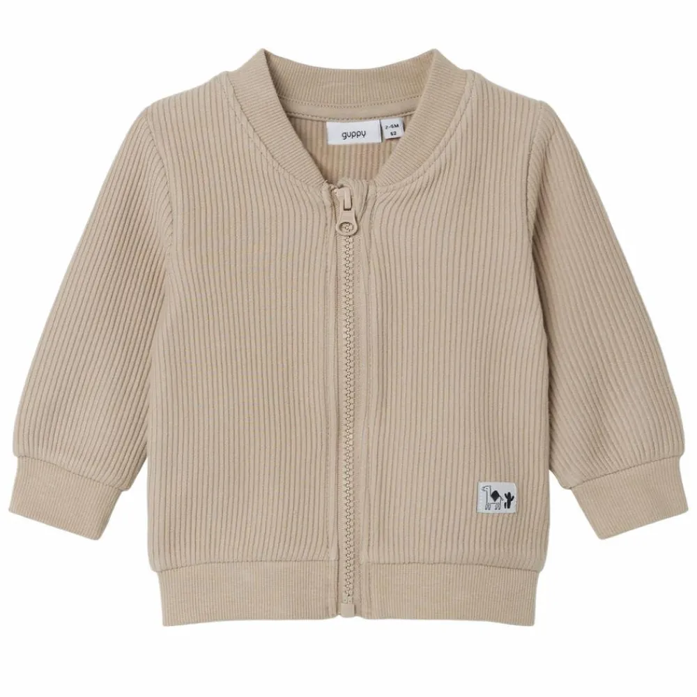 Guppy baby cardigan med gennemgående lynlås og ribkant ved ærmer, hals og bund.