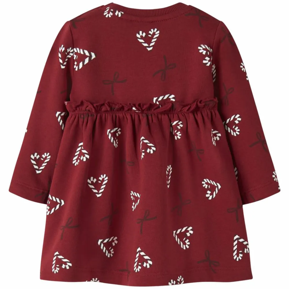 Guppy baby julekjole. Sød kjole i sweat materiale med fint jule mønster og flæse detalje. Kjolen har en rund halsudskæring med rib, to tryknapper ved skulderen og en blød, børstet inderside. Perfekt til hverdag og festlige lejligheder, i de hyggelige julemåneder.